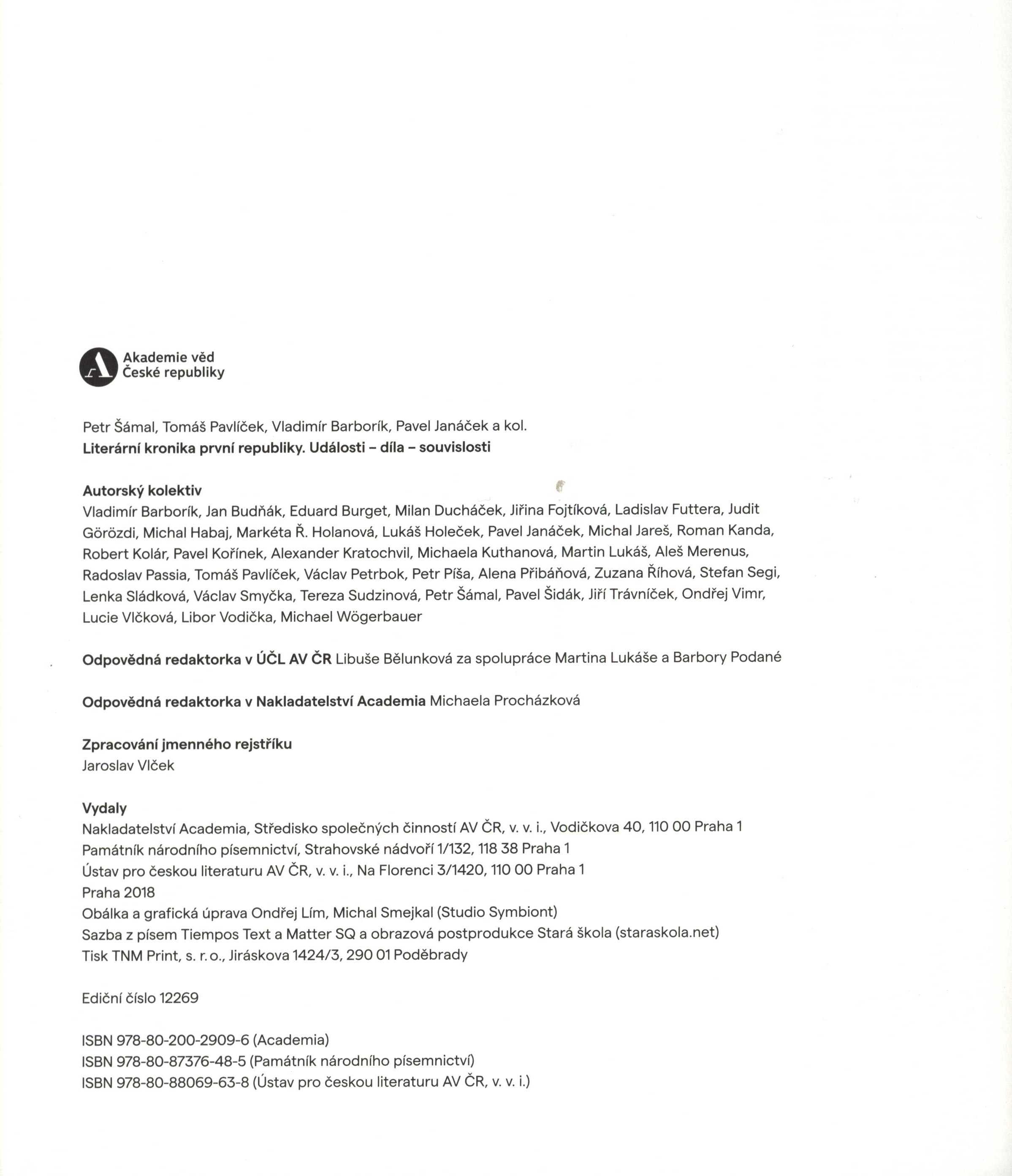 Title information Literární kronika první republiky : události, díla, souvislosti / Petr Šámal, Tomáš Pavlíček, Vladimír Barborík, Pavel Janáček a kol. Personal name Šámal, Petr, 1972- (Author) Další autoři Pavlíček, Tomáš, 1972- (Author) Barborík, Vladimír, 1965- (Author) Janáček, Pavel, 1968- (Author) Lím, Ondřej, 1976- (Bookjacket designer) (Book designer) Smejkal, Michal (Bookjacket designer) (Book designer) Corporation Academia (nakladatelství) (Publisher) Památník národního písemnictví (muzeum literatury) (Publisher) Ústav pro českou literaturu (Akademie věd ČR) (Publisher) TNM PRINT s. r. o. (tiskárna) (Printer) Edition statement 1. vydání Publication Praha : Academia : Památník národního písemnictví : Ústav pro českou literaturu AV ČR, 2018 Manufacture Poděbrady : TBN Print, s.r.o. Scope 518 stran : ilustrace, portréty, faksimile ; 29 cm ISBN 978-80-200-2909-6 (Academia ; vázáno) 978-80-87376-48-5 (Památník národního písemnictví ; vázáno) 978-80-88069-63-8 (Akademie věd České republiky. Ústav pro českou literaturu ; vázáno) Country Czech Republic Language Czech Note Ilustrace na obálce. - Na zadní straně obálky anotace. - Barevné i černobílé fotografie, kresby a faksimile. - Obsahuje bibliografické odkazy, bibliografii a rejstřík. - Anglické resumé.
