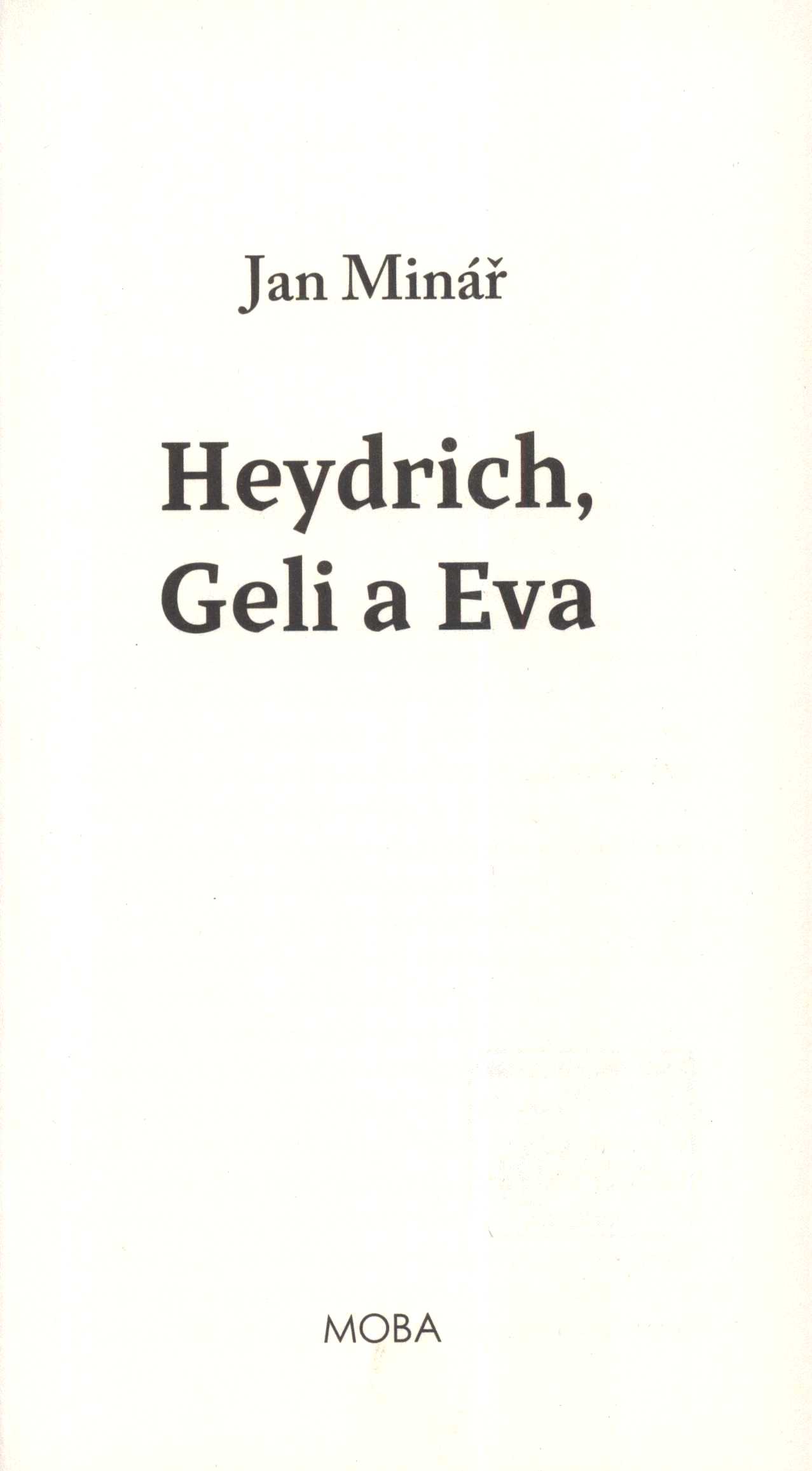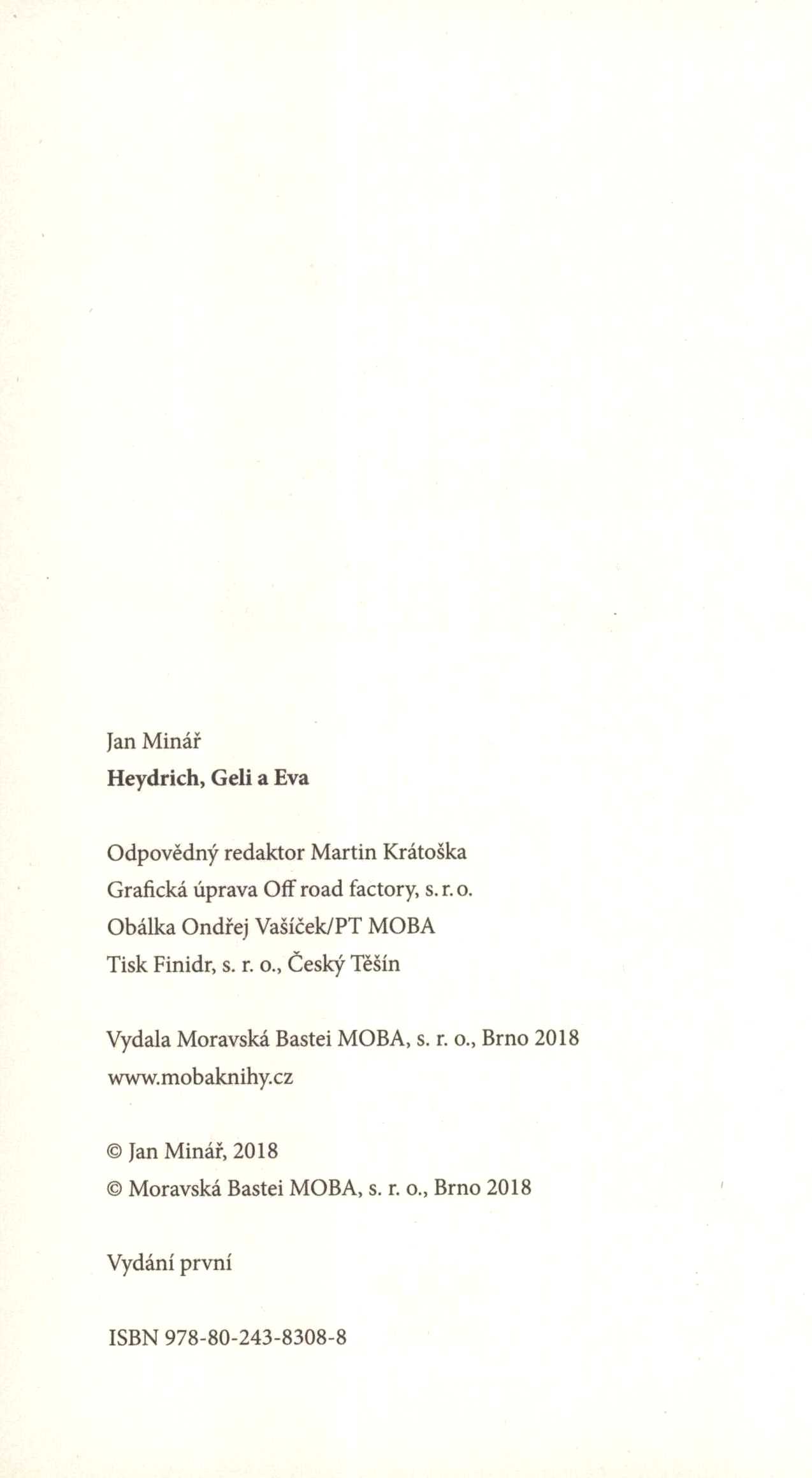 Title information Heydrich, Geli a Eva / Jan Minář ; obálka Ondřej Vašíček/PT MOBA Personal name Minář, Jan, 1949- (Author) Další autoři Vašíček, Ondřej (Bookjacket designer) Corporation Nakladatelství MOBA (Publisher) Finidr (tiskárna) (Printer) Edition statement Vydání první Publication Brno : MOBA, 2018 Manufacture Český Těšín : Finidr, s.r.o. Scope 247 stran ; 21 cm ISBN 978-80-243-8308-8 (vázáno) Country Czech Republic Language Czech Note Grafická úprava Off road factory, s.r.o. - Barevná vazba s ilustrací, s bílým textem a s nakladatelskou značkou na hřbetu. - Barevné přídeští a předsádky (mapa). - Nakladatelská značka na vakátě. - Údaje tiráže proti titulnímu listu. - Anotace knihy a nakladatelská značka na zadní straně vazby.