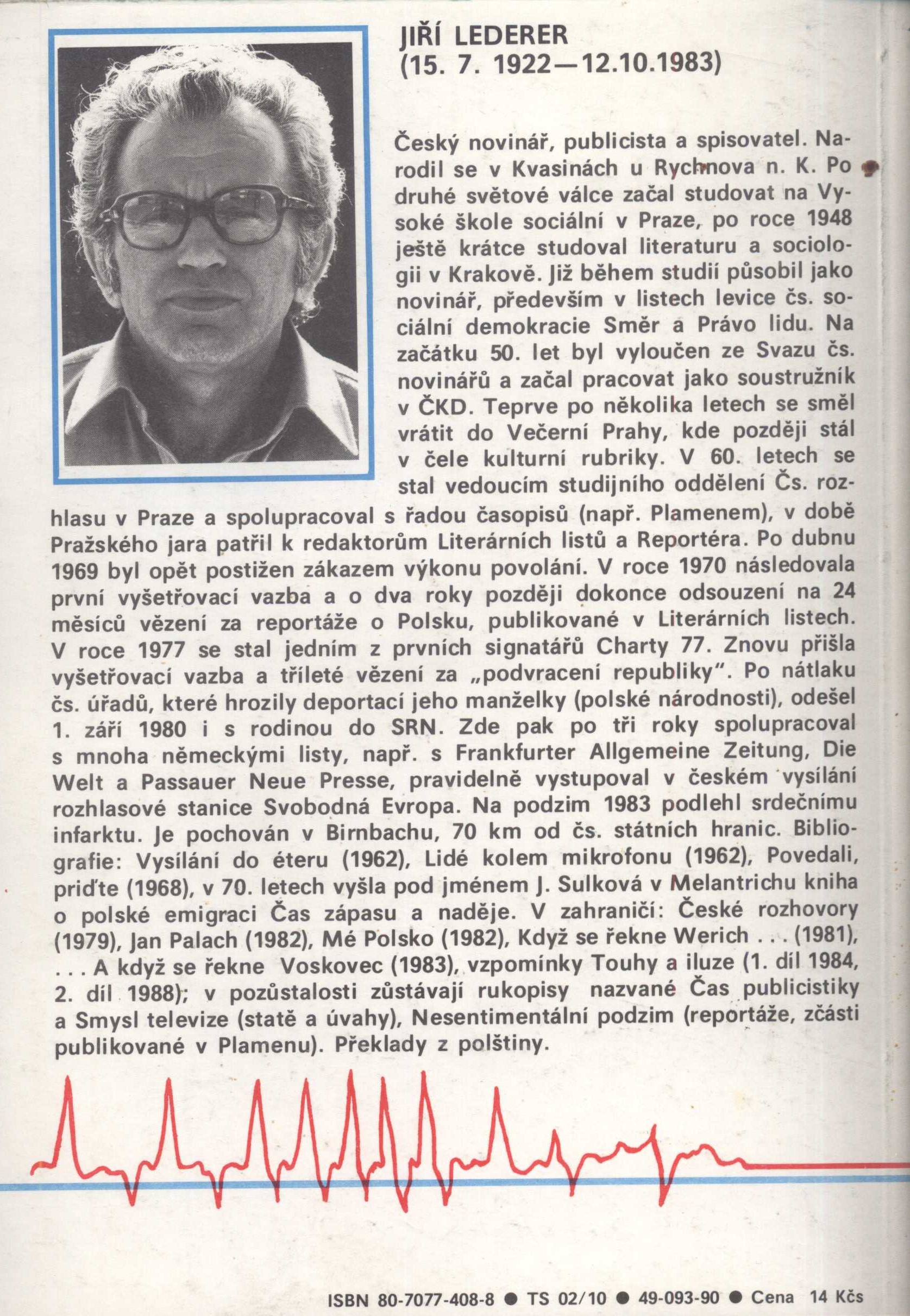 Title information Jan Palach : zpráva o životě, činu a smrti českého studenta / Jiří Lederer Personal name Lederer, Jiří, 1922-1983 (Author) Další autoři Teprt, Lubomír, 1953- (Bookjacket designer) (Book designer) Corporation Vydavatelství Novinář (Publisher) Grafia (Zlín, Česko) (Printer) Edition statement I. vydání Publication Praha : vydavatelství a nakladatelství Novinář, 1990 Manufacture Zlín : Grafia, st. p. Scope 149 stran ; 21 cm ISBN 80-7077-408-8 (brožováno) Country Czech Republic Language Czech Note Obálka a grafická úprava Lubomír Teprt