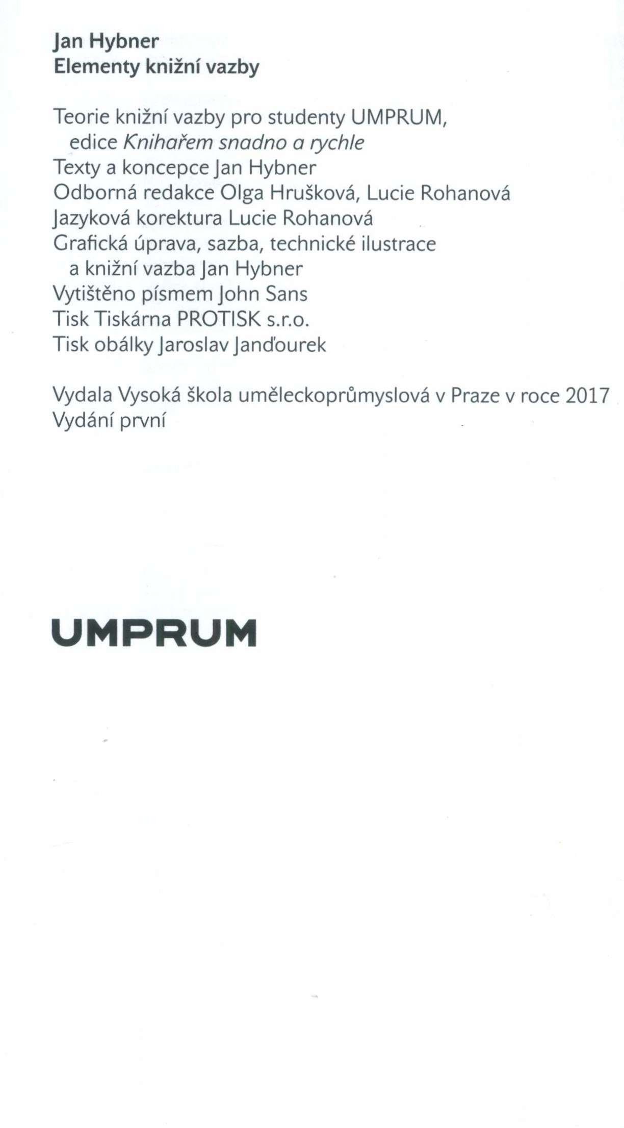 Title information Elementy knižní vazby / Jan Hybner (texty, koncepce, ilustrace a grafický návrh) ; grafická úprava, sazba, technické ilustrace a knižní vazba Jan Hybner Personal name Hybner, Jan, 1964- (Author) (Illustrator) (Book designer) (Compositor) (Binder) Další autoři Janďourek, Jaroslav, 1958- (Printer) Corporation Vysoká škola uměleckoprůmyslová (vydavatelství) (Publisher) Protisk (tiskárna, České Budějovice) (Printer) Edition statement Vydání první Publication V Praze : Vysoká škola uměleckoprůmyslová, 2017 Manufacture České Budějovice : Tiskárna PROTISK s.r.o. Scope 123 stran : ilustrace ; 20 cm ISBN 978-80-87989-35-7 (brožováno) Edition Knihařem snadno a rychle