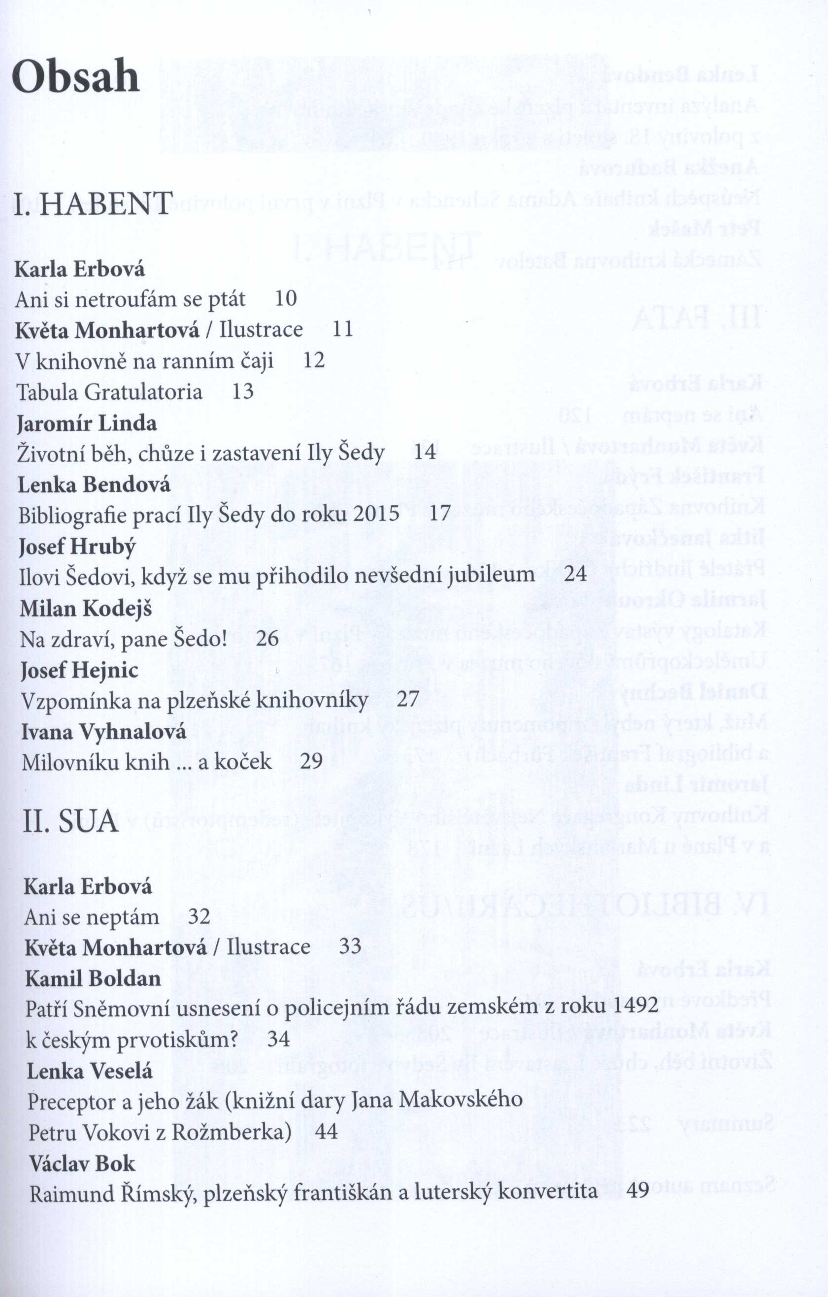 Title information Habent sua fata bibliothecarii : věnováno PhDr. Ilovi Šedovi / Jaromír Linda, Jitka Janečková, Jiří Jelen, Lenka Bendová (eds.) ; ilustrace: Květa Monhartová (včetně návrhu obálky), Vladimír Líbal Další autoři Linda, Jaromír, 1965- (Editor) Janečková, Jitka, 1965- (Editor) Jelen, Jiří, 1968- (Editor) Bendová, Lenka, 1989- (Editor) Monhartová, Květa, 1938- (Illustrator) (Bookjacket designer) Líbal, Vladimír, 1954- (Illustrator) Corporation Západočeské muzeum (Plzeň, Česko) (Publisher) Nava Tisk (tiskárna) (Printer) Publication Plzeň : Západočeské muzeum v Plzni, 2019 Manufacture Plzeň : NAVA Tisk, s. r. o. Scope 231 stran : ilustrace, portréty, faksimile ; 24 cm ISBN 978-80-7247-159-1 (brožováno) Country Czech Republic Language Czech Note Barevná, graficky zdobená obálka; černý obdélník se žlutým textem. - Černý hřbet se žlutým textem. - Patitul. - Černobílý portrét I. Šedy od V. Líbala. - Báseň K. Erbové "Ani si netroufám se ptát". - Poděkování. - Obsah. - Báseň K. Erbové "Ani si netroufám se ptát". - Černobílé ilustrace K. Monhartové. - Úvod. - Tabula Gratulatoria. - Černobílé ilustrace, portréty, faksimile s popisky. - Ediční poznámka. - Přílohy. - Obrazové přílohy. - Báseň K. Erbové "Předkové nýmandi". - Černobílá ilustrace K. Monhartové. - Černobílé fotografie s popisky (archiv I. Šedy). - Seznam autorů příspěvků.