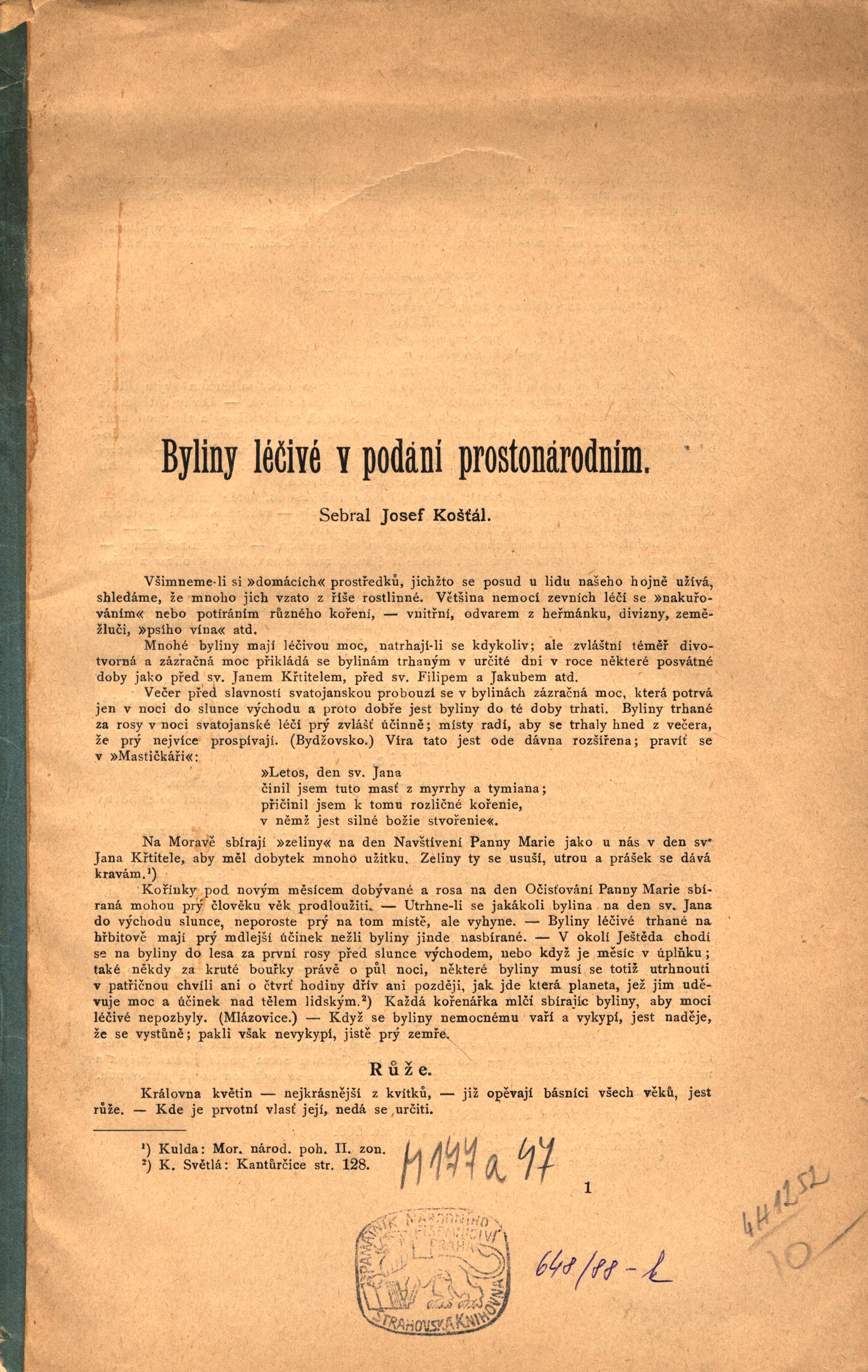 Title information Byliny léčivé v podání prostonárodním / sebral Josef Košťál Personal name Košťál, Josef, 1851-1920 (Author) (Publisher) Další autoři Alois Wiesner, knihtiskař České akademie císaře Františka Josefa pro vědy, slovesnost a umění (Praha) (Printer) Publication [Praha?] : nákladem vlastním, [1896?] Manufacture V Praze : tisk Al. Wiesnera Scope 19 stran ; 27 cm ISBN (Brožováno) Country Czech Republic Language Czech Document kind separáty Keywords pojednání * lidové léčitelství * léčivé rostliny * byliny * lidové pověry * lidové tradice * lidové zvyky * národopis * stol. 18.-19. UDC 398.1 * 39 Uživatelské pole PNP Sign. M 177 a 47: Separát bez obálky. - Nakladatelské údaje převzaty ze Souborného katalogu Nár. knihovny Call number Track No. Location Info M 177 a 47 0648/1988 Sbírka