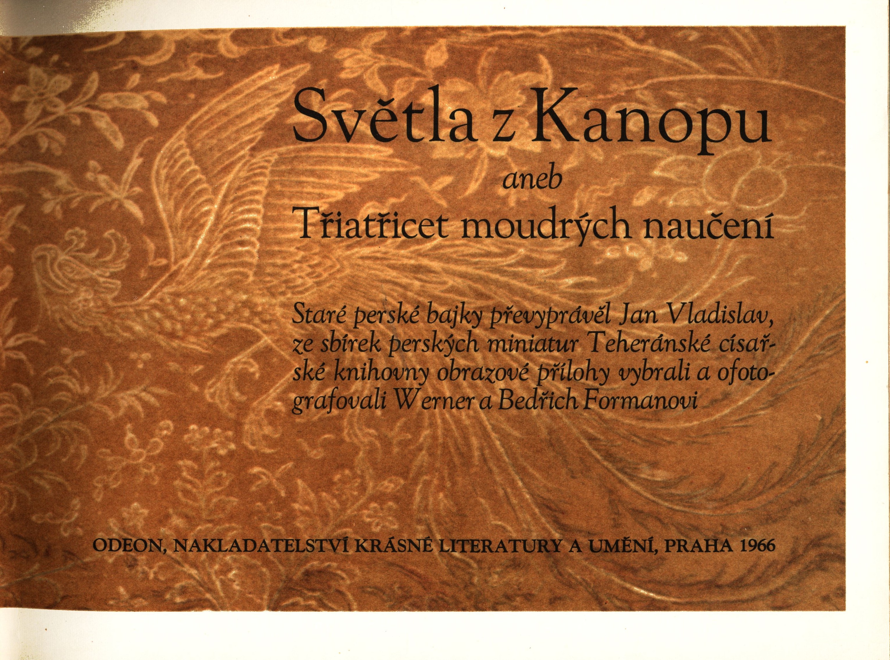 Title information Světla z Kanopu, aneb, Třiatřicet moudrých naučení / staré perské bajky převyprávěl Jan Vladislav ; ze sbírek perských miniatur Teheránské knihovny obrazové přílohy vybrali a ofotografovali Werner a Bedřich Formanovi Personal name Vladislav, Jan, 1923-2009 (Author) Další autoři Forman, Werner, 1921-2010 (Compiler) (Photographer) Forman, Bedřich, 1919-1985 (Compiler) (Photographer) (Bookjacket designer) (Book designer) Corporation Odeon (nakladatelství) (Publisher) Polygrafia (firma) (Printer) Edition statement Vydání první Publication Praha : Odeon, nakladatelství krásné literatury a umění, 1966 Manufacture Polygrafia Scope 130 stran : barevné ilustrace ; 21 cm ISBN (vázáno) Country Czech Republic Language Czech Language of the original Multiple languages Note Ilustrovaná obálka. - Ilustrovaná přídeští. - Ilustrovaný frontispis a titulní list. - Dvoubarevný text. - Celostránkové nečíslované ilustrace. - Obsah. - Tiráž.