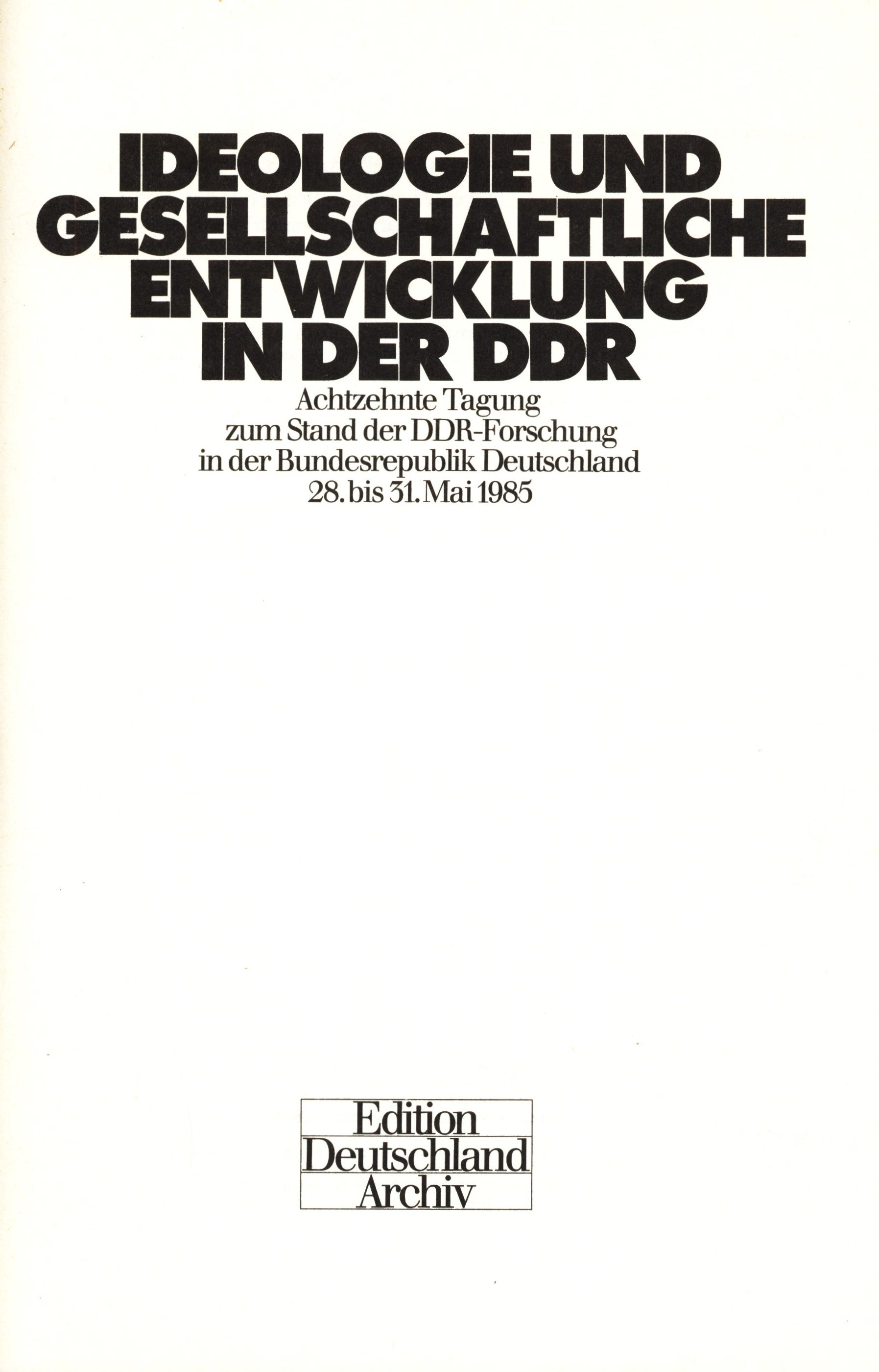 Title information Ideologie und gesellschaftliche Entwicklung in der DDR : Achtzehnte Tagung zum Stand der DDR-Forschung in der Bundesrepublik Deutschland 28. - 31. Mai 1985 / Herausgegeben von Ilse Spittmann-Rühle und Gisela Helwig Personal name Spittmann-Rühle, Ilse, 1930-2022 (Redactor) Další autoři Helwig, Gisela, 1940-2020 (Redactor) Publication Köln : Edition Deutschlad Archiv, 1985 Manufacture Gütersloh : Mohndruck Graphische Betriebe GmbH Scope 176 stran ; 24 cm ISBN 3-8046-0326-2 (brožováno) Country Germany Language German Note Typografická barevná obálka. - Černobílý titulní list.