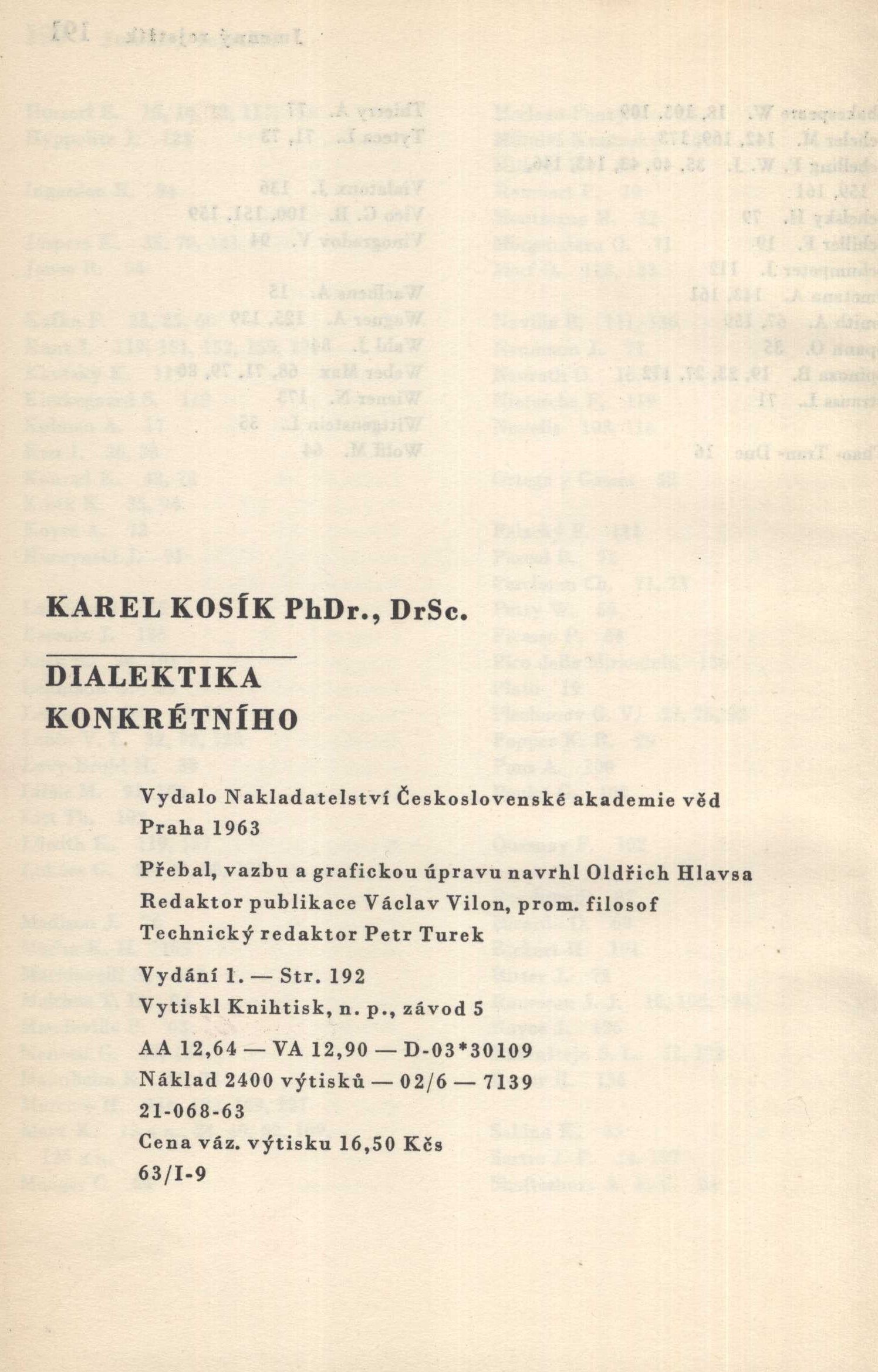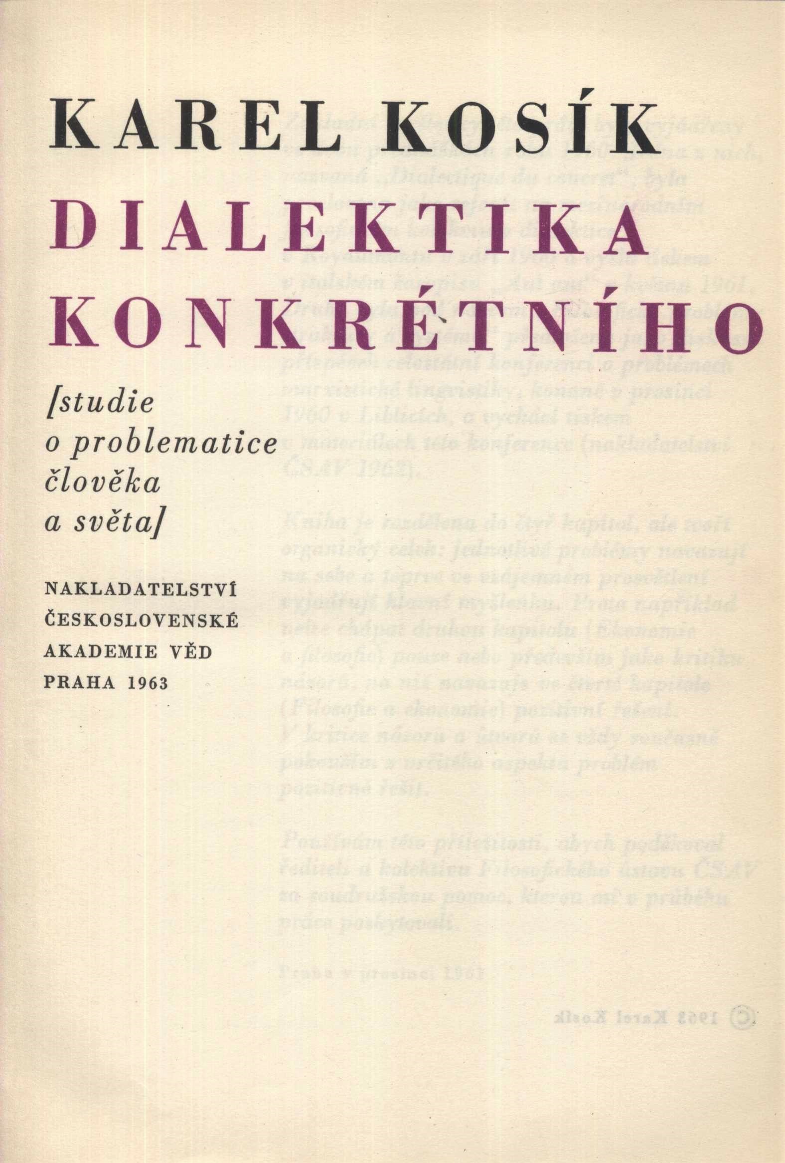 Title information Dialektika konkrétního : studie o problematice člověka a světa / Karel Kosík ; přebal, vazbu a grafickou úpravu navrhl Oldřich Hlavsa Personal name Kosík, Karel, 1926-2003 (Author) Další autoři Hlavsa, Oldřich, 1909-1995 (Bookjacket designer) (Binder) (Book designer) Corporation Nakladatelství Československé akademie věd (Publisher) Knihtisk (tiskárna) (Printer) Edition statement 1. vydání Publication Praha : Nakladatelství Československé akademie věd, 1963 Manufacture [Praha] : Knihtisk, n.p., závod 5 Scope 191 stran ; 21 cm ISBN (Vázáno) Country Czech Republic Language Czech Note Barevný obálka, barevný text. - Barevná, graficky zdobená vazba, bílý plátěný hřbet s černý textem. - Barevné předsádky. - Patitul, tužkou psané jméno Sychrová. - Dvojbarevný text na titulním listu. - Předmluva autora. - Obsah. - Text rozdělen do 4 kapitol. - Na zadní záložce anotace knihy. - Přebal.
