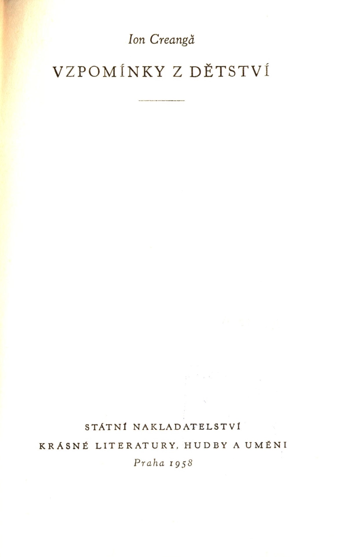 Světová četba, (Státní nakladatelství krásné literatury, hudby a umění)Country Czech Republic Language Czech Language of the original Romanian, Moldavian Note Barevná zdobená obálka. - Na přední záložce obálky anotace. - Na frontispisu bio-bibliografická poznámka o autorovi. - Vysvětlivky. - 13 000 výtisků.