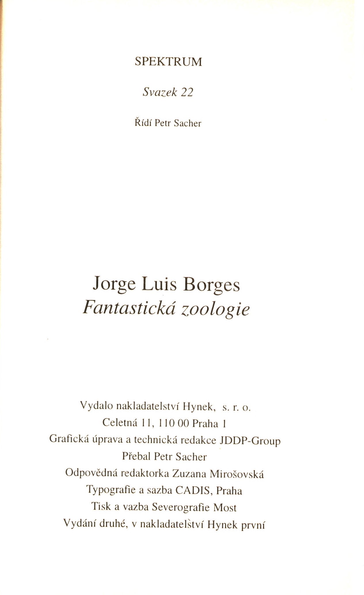 Title information Fantastická zoologie / Jorge Luis Borges ; ve spolupráci s Margaritou Guerrerovou ; přeložil František Vrhel Personal name Borges, Jorge Luis, 1899-1986 (Author) Další autoři Guerrero, Margarita (Author) Vrhel, František, 1943-2023 (Translator) Sacher, Petr, 1944- (Bookjacket designer) Corporation Hynek (nakladatelství) (Publisher) Cadis (DTP studio) (Compositor) Severografia (tiskárna, Most) (Printer) Edition statement Vydání druhé, v nakladatelství Hynek první Publication Praha : Hynek, 1999 Manufacture Most : Severografie Scope 239 stran : ilustrace ; 19 cm ISBN 80-86202-61-5 (vázáno) Edition Spektrum ; svazek 22
