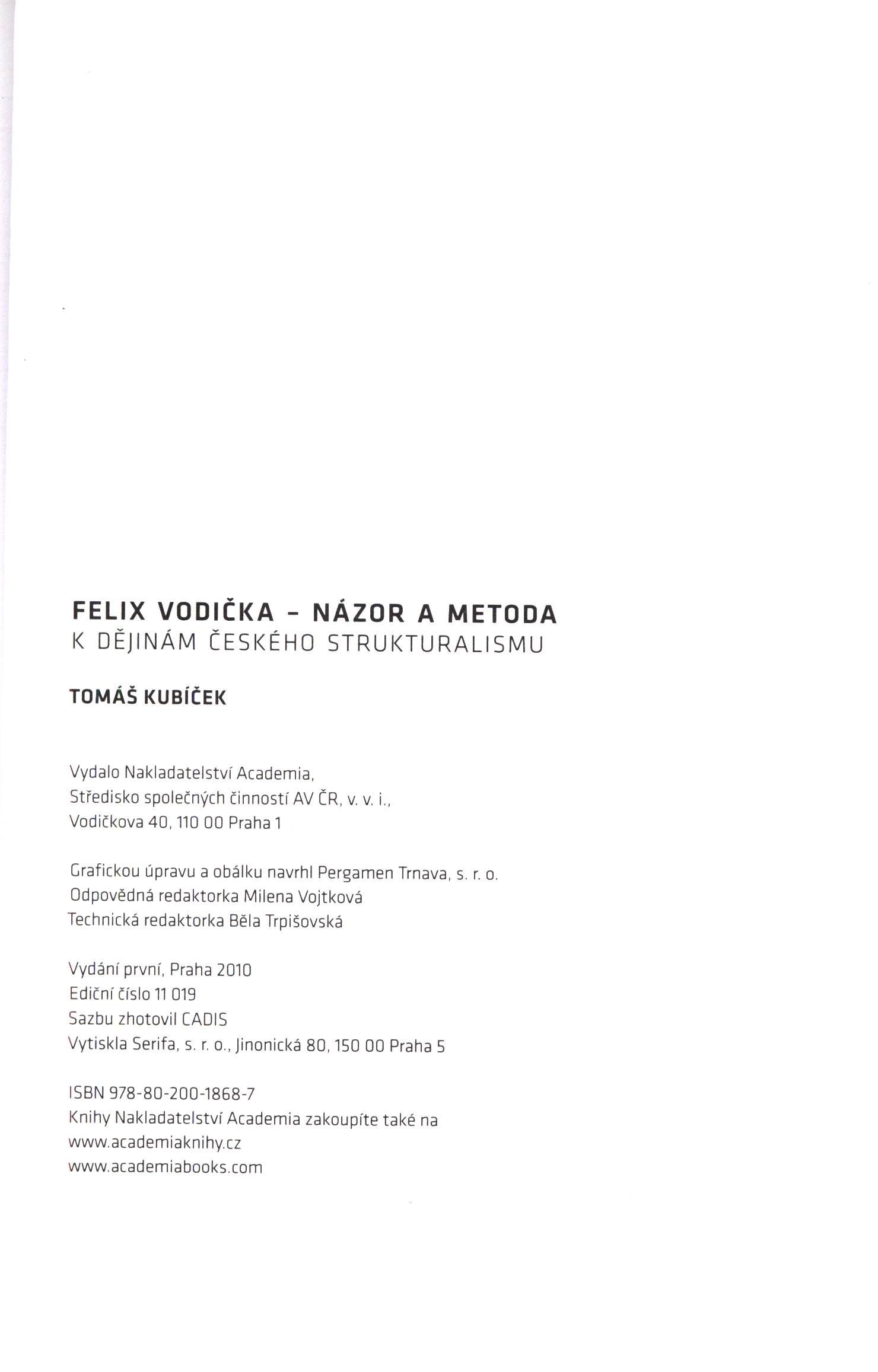 $a Felix Vodička - názor a metoda : $b k dějinám českého strukturalismu / $c Tomáš Kubíček 250 $a Vydání první 264 -1