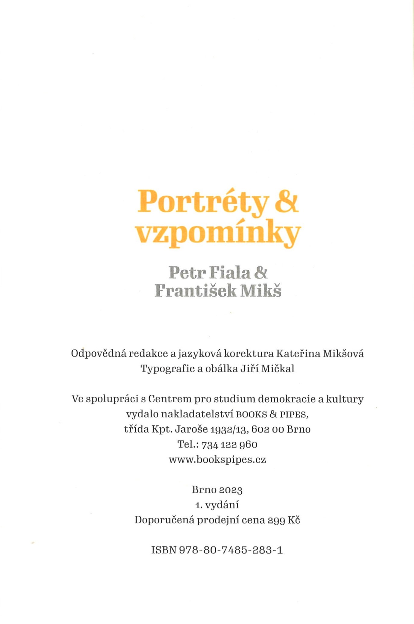 Title information Portréty & vzpomínky / Petr Fiala & František Mikš ; typografie a obálka Jiří Mičkal Personal name Fiala, Petr, 1964- (Author) Další autoři Mikš, František, 1966- (Author) Mičkal, Jiří, 1978- (Typographer) (Bookjacket designer) Corporation Books & Pipes Publishing (nakladatelství) (Publisher) Centrum pro studium demokracie a kultury (Publisher) Edition statement 1. vydání Publication Brno : Books & Pipes, 2023 Scope 245 stran : portréty, fotografie ; 19 cm ISBN 978-80-7485-283-1 (brožováno) : Country Czech Republic Language Czech Note Ve spolupráci s Centrem pro studium demokracie a kultury vydalo nakladatelství Books & Pipes. - Zdobená obálka. - Frontispis. - Slovo úvodem. - Medailony osobností. - Černobílé celostránkové portréty a fotografie