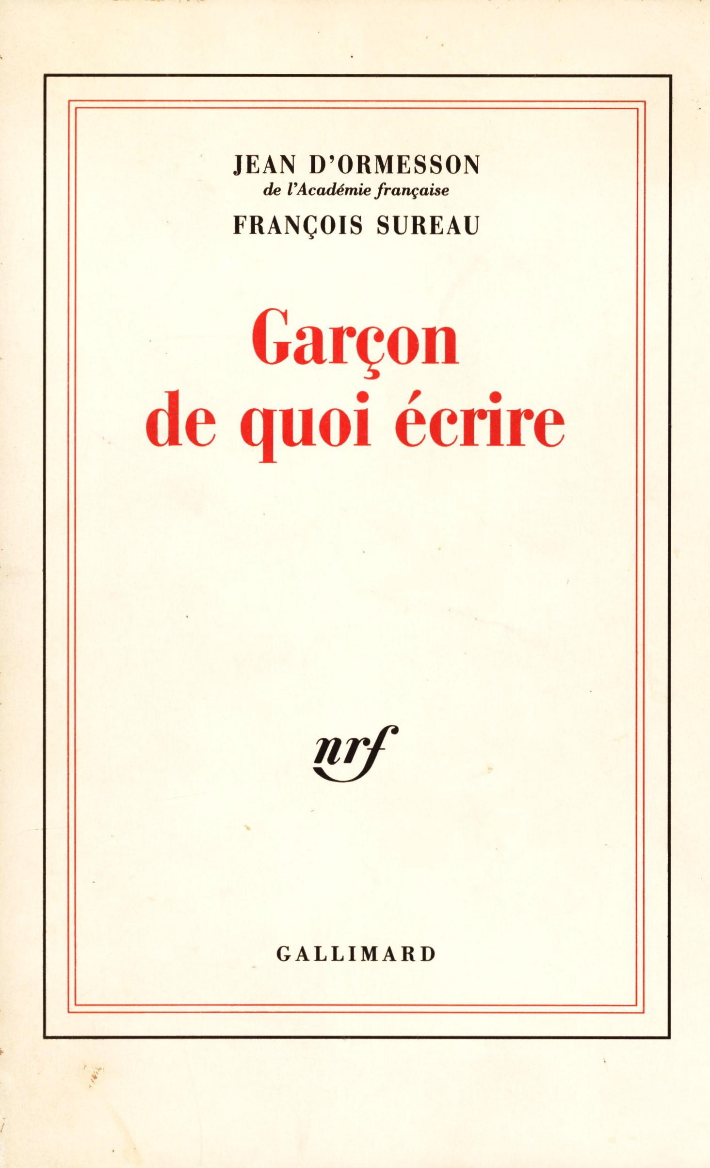 Title information Garçon de quoi écrire / Jean d'Ormesson ; François Sureau Personal name Ormesson, Jean d', 1925-2017 (Author) Další autoři Sureau, François, 1957- (Author) Corporation Gallimard (firma) (Publisher) Société Nouvelle Firmin Didot (tiskárna) (Printer) Publication Paris : Gallimard, 1989 Manufacture Mesnil-sur-l'Estrée : Société Nouvelle Firmin Didot Scope 276 stran ; 21 cm ISBN 2-07-071762-3 (brožováno) Country France Language French Note Dvoubarevná obálka. - Černobílý titulní list s nakladatelským signetem. - Obsah.