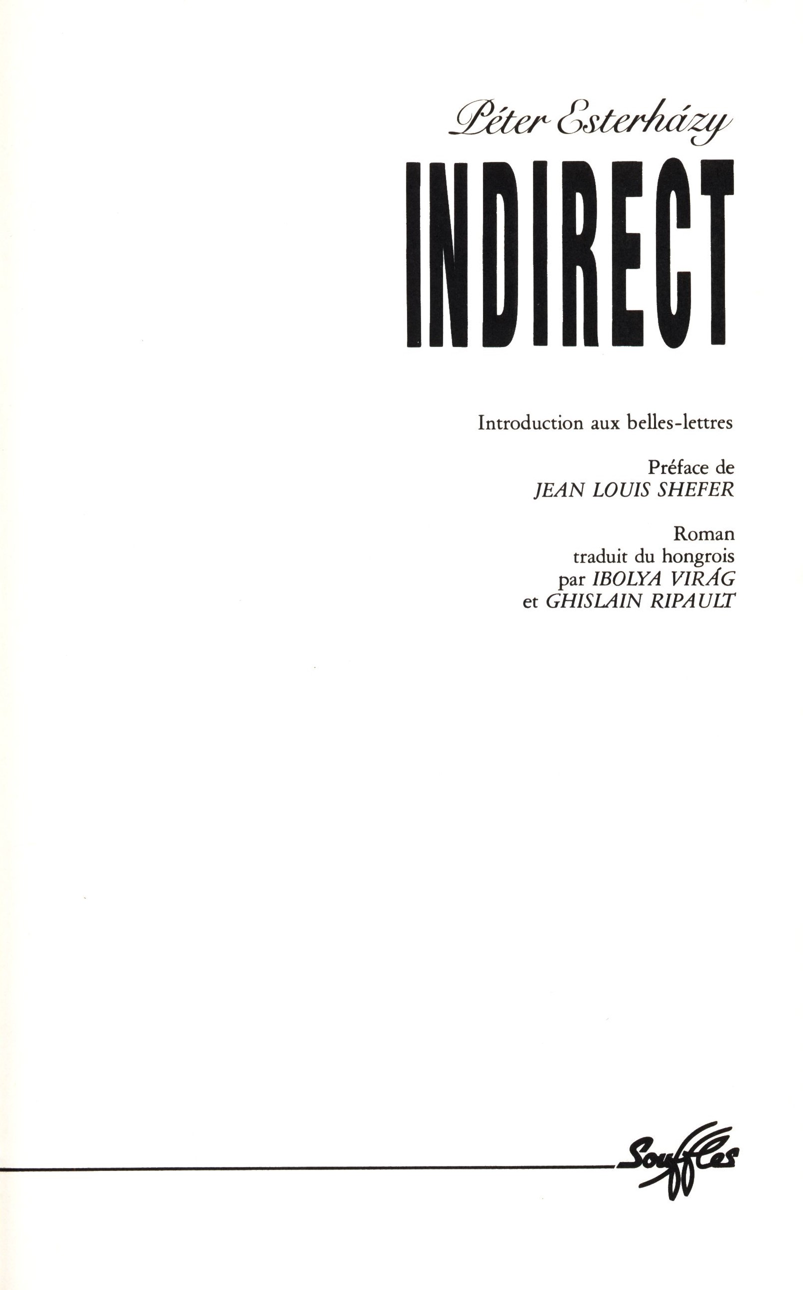 Title information Indirect : Introduction aux belles-lettres / Peter Esterházy ; Préface de Jean Louis Shefer ; Roman traduit du hongrois par Ibolya Virág et Ghislain Ripault Personal name Esterházy, Péter, 1950-2016 (Author) Další autoři Ripault, Ghislain, 1947- (Translator) Corporation Souffles (firma) (Publisher) Corlet Numérique (tiskárna) (Printer) Publication Paris : Souffles, 1988 Manufacture Condé-sur-Noireau : Corlet, Imprimeur, SA Scope 150 stran ; 22 cm ISBN 2-87658-007-1 (vázáno) Edition Europe centrale
