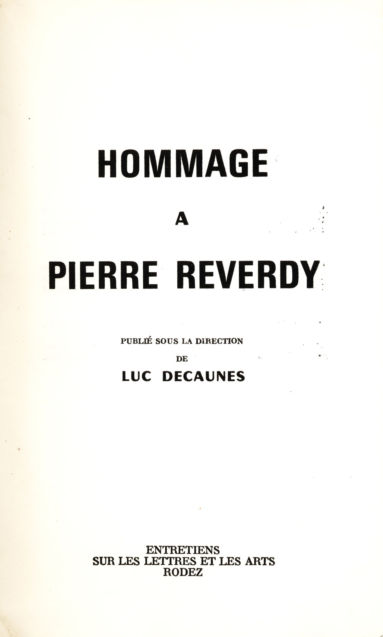Title information Hommage à Pierre Reverdy / publié sous la direction de Luc Decaunes Personal name Decaunes, Luc, 1913-2001 (Author) Další autoři Subervie (firma) (Publisher) Publication Rodez : Subervie éditeur, [1961] Scope 202 stran : fotografie, faksimile ; 23 cm ISBN (vázáno) Edition Entretiens ; 20