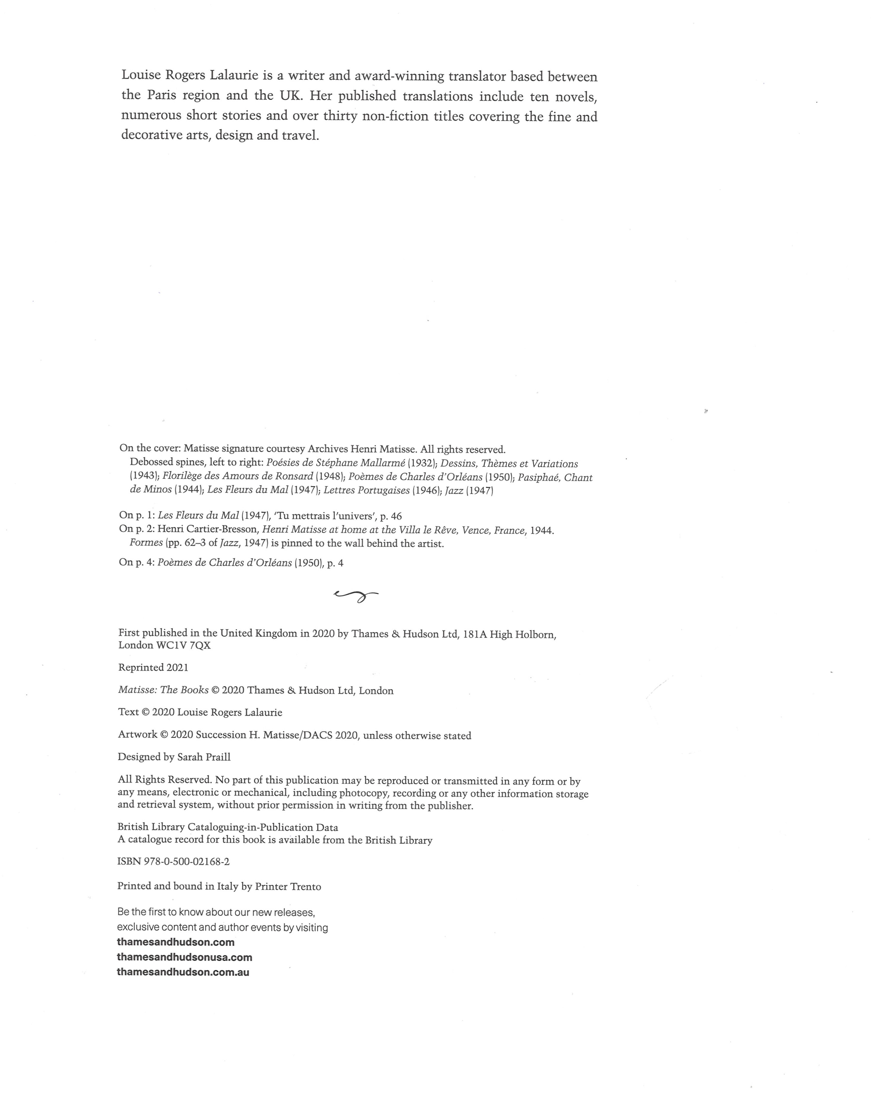 Title information Matisse : the books : over 200 illustrations / Louse Rogers Lalaurie Personal name Lalaurie, Louise Rogers (Author) Další autoři Matisse, Henri, 1869-1954 (Artist) Corporation Thames and Hudson (nakladatelství) (Publisher) Printer Trento (tiskárna) (Printer) Edition statement First published Publication Lodon : Thames and Hudson Ltd, 2021 Manufacture [Trento], Itálie : Printer Trento Scope 319 stran : ilustrace (některé barevné), faksimile, reprodukce, portréty ; 32 cm ISBN 978-0-500-02168-2 (vázáno) Country United Kingdom Language English Language of the original French Note Celoplátěná zdobená vazba se slepotiskem. - Frontispis s portrétem umělce. - Obsahuje další portréty umělce, černobílé fotografie, barevné reprodukce ilustrací a obrazů, faksimile textů. - Poznámky. - Seznam vyobrazení. - Na zadní desce vazby nakladatelská páska