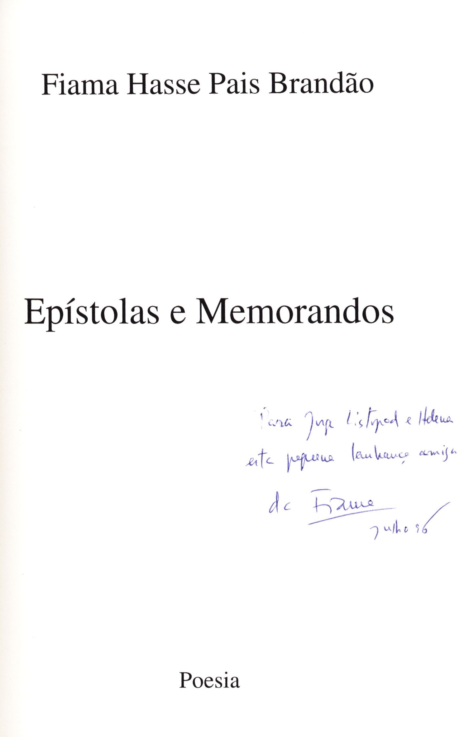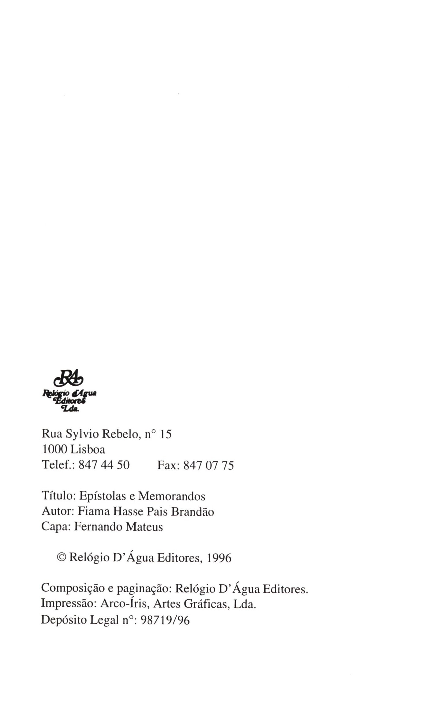 Title information Epístolas e memorandos / Fiama Hasse Pais Brandão Personal name Brandão, Fiama Hasse Pais, 1938-2007 (Author) Další autoři Relógio d’Agua (nakladatelství) (Publisher) Arco-Íris, Artes Gráficas, Lda. (Printer) Publication [Lisboa] : Relógio d’Agua, [1996] Manufacture Arco-Íris, Artes Gráficas, Lda. Copyright notice date ©1996 Scope 40 stran : ilustrace ; 21 cm ISBN 972-708-310-2 (brožováno) Country Portugal Language Portuguese Note Zdobená obálka. - Ilustrace