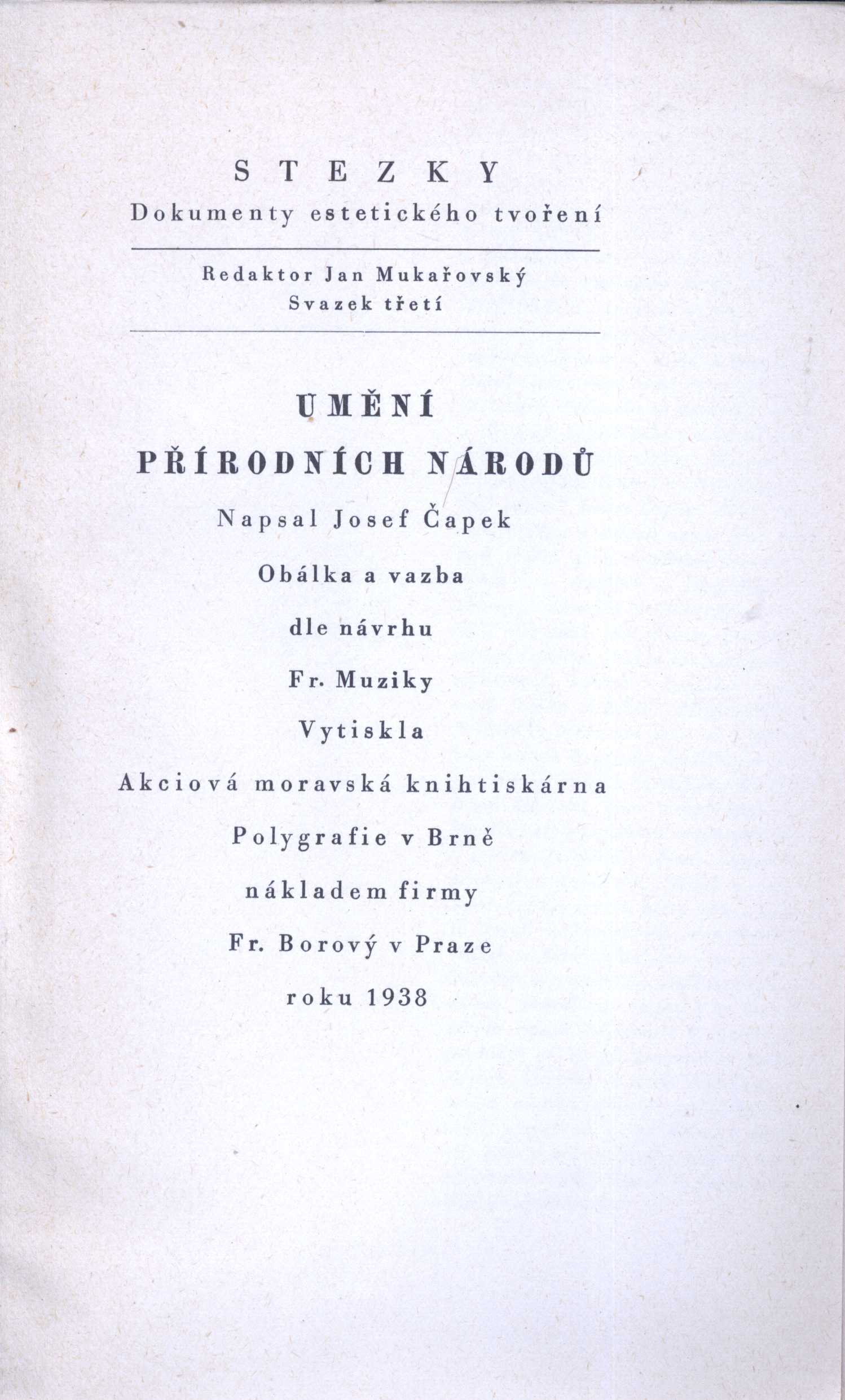 Title information Umění přírodních národů / Josef Čapek ; [obálka a vazba dle návrhu Fr. Muziky] Personal name Čapek, Josef, 1887-1945 (Author) Další autoři Muzika, František, 1900-1974 (Bookjacket designer) Corporation Fr. Borový (firma) (Publisher) Akciová moravská knihtiskárna Polygrafie (Printer) Publication V Praze : Fr. Borový, 1938 Scope 324, XXXII s. obr. příl. : il. ISBN brož. Edition Stezky. dokumenty estetického tvoření sv. 3