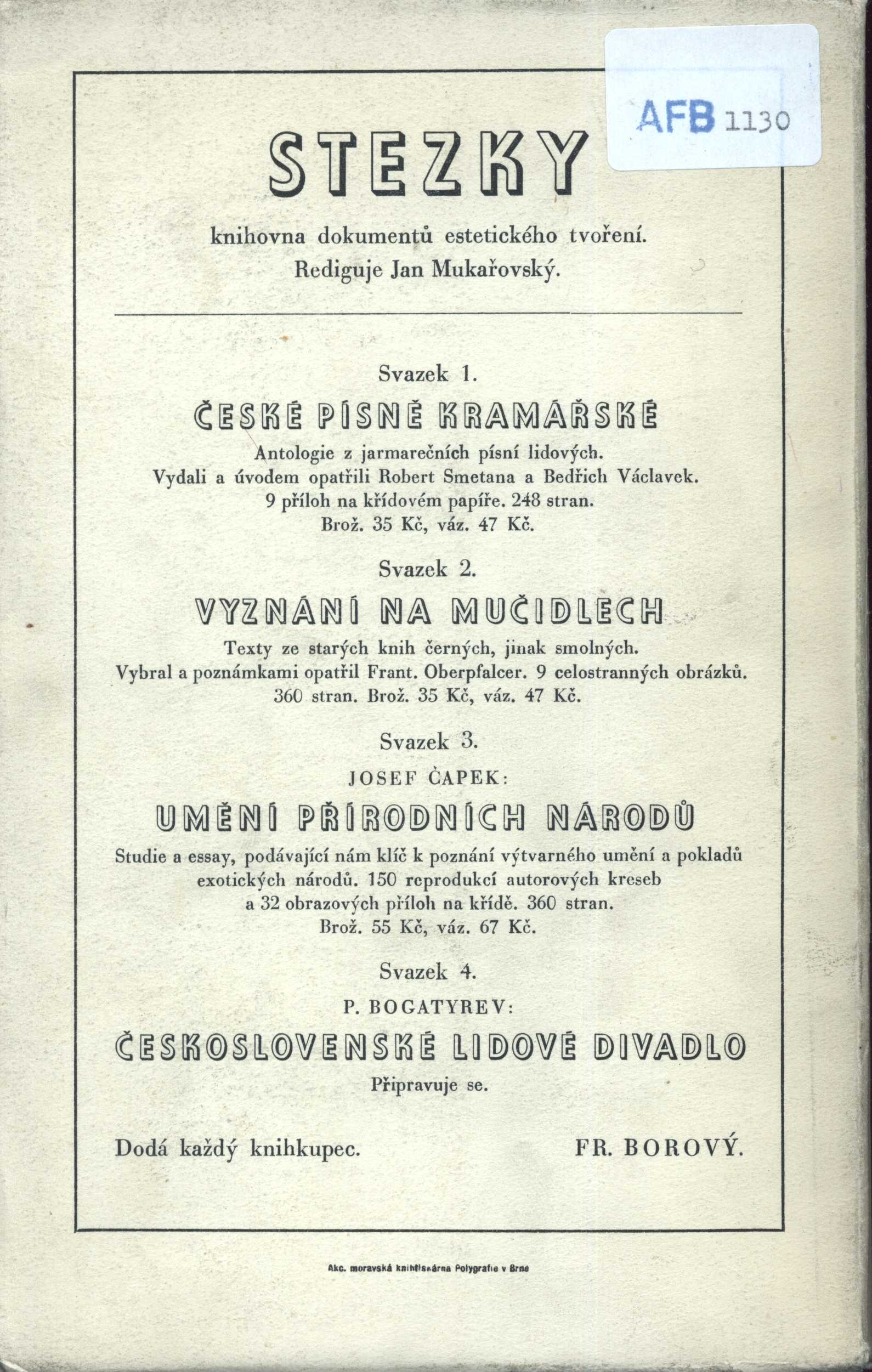 Stezky, dokumenty estetického tvoření (Fr. Borový)Country Czech Republic Language Czech Note Zdobená obálka. - Na záložce poznámka o knize - Nakladatelská značka. - Dvoubarevný titulní list. - Úvod autora. - Černobílé kresby a ilustrace. - Černobílé fotografie na křídovém papíře. - Na konci knihy značka nakladatelského sdružení Kmen. - Na zadní straně obálky nakladatelská upoutávka na knihy vydané v edici Stezky.