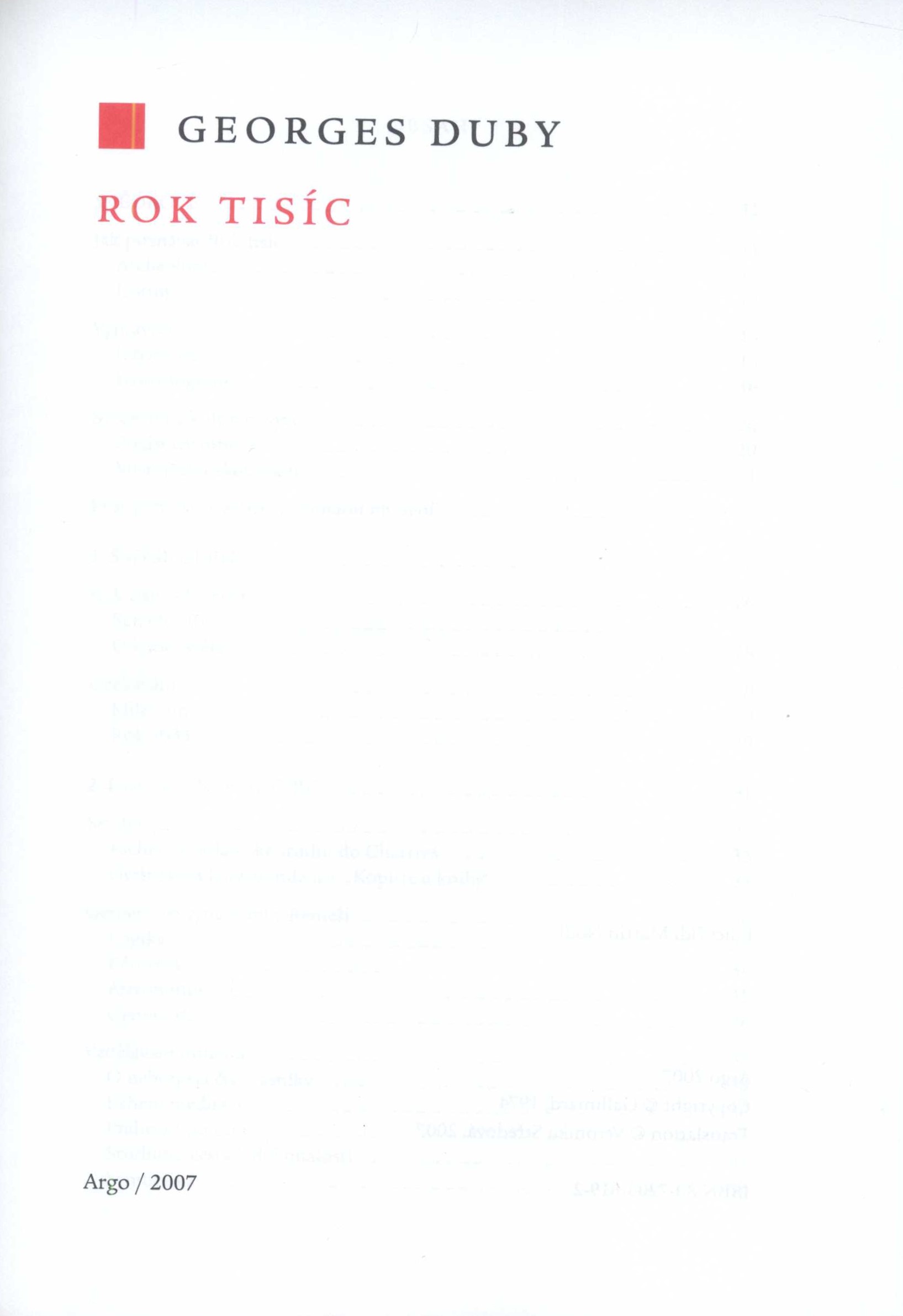 Title information Rok tisíc / Georges Duby ; z francouzského originálu L’An Mil ... přeložila Veronika Středová Personal name Duby, Georges, 1919-1996 (Author) Další autoři Novák, Robert V., 1962- (Book designer) (Bookjacket designer) Středová, Veronika, 1974- (Translator) Corporation Argo (nakladatelství) (Publisher) Akcent, spol. s r.o. (tiskárna) (Printer) Studio Marvil (grafické studio) (Compositor) Edition statement Vydání první Publication Praha : Argo, 2007 Manufacture [Praha] : tiskárna Akcent Scope 150 stran ; 22 cm ISBN 80-7203-819-2 (vázáno) Edition Edice Každodenní život ; svazek 35
