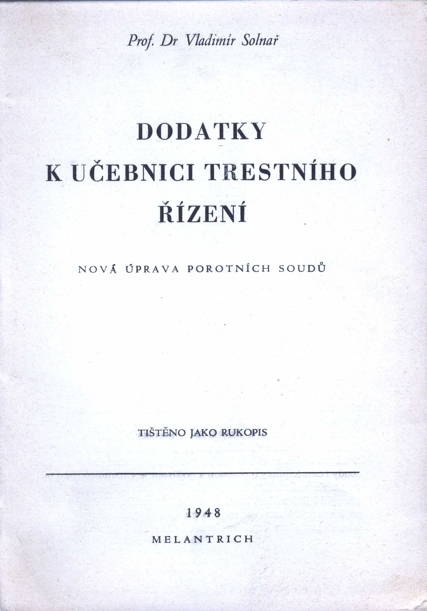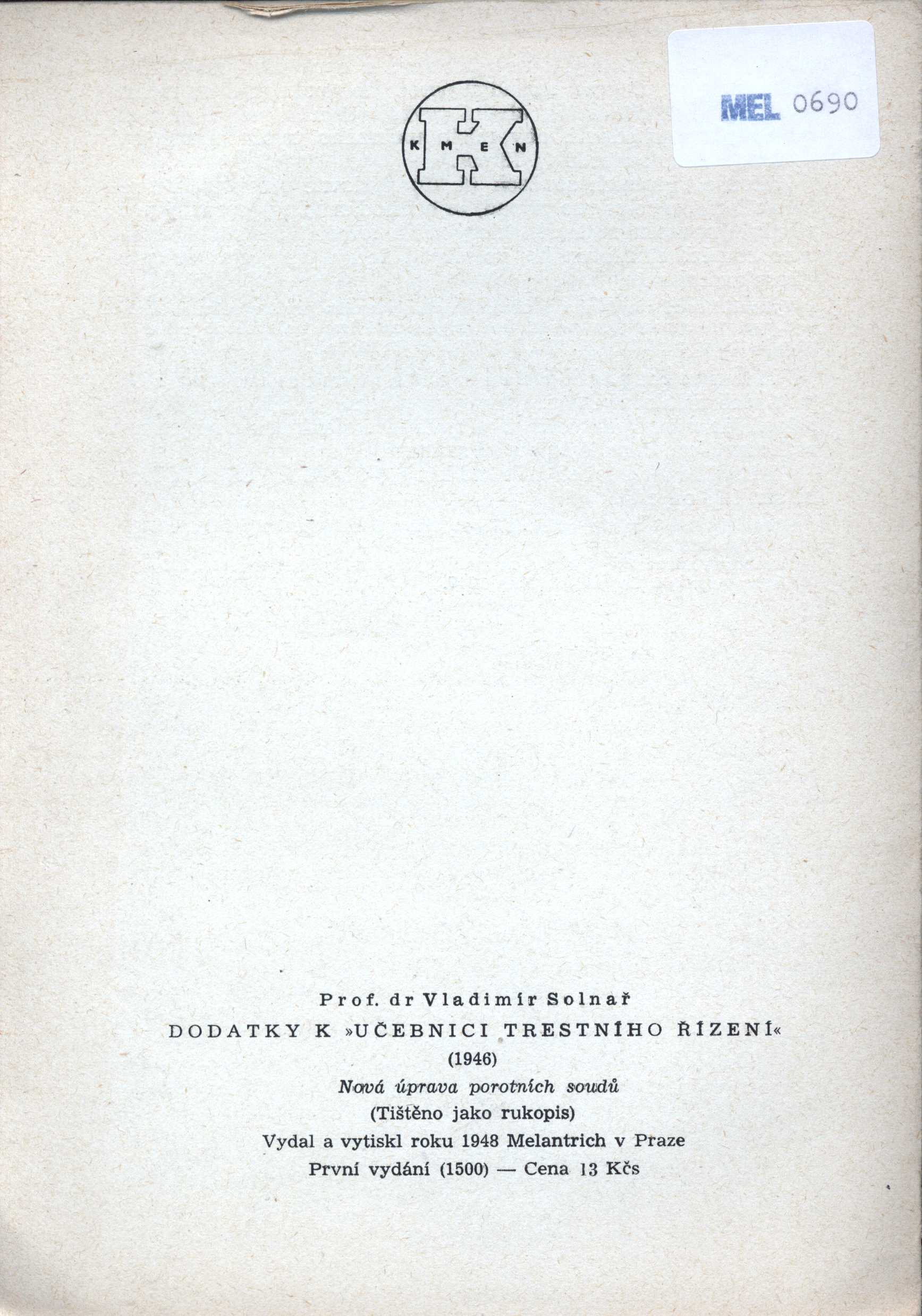 Title information Dodatky k učebnici trestního řízení : nová úprava porotních soudů / Vladimír Solnař Personal name Solnař, Vladimír, 1899-1976 (Author) Další autoři Melantrich (nakladatelství) (Publisher) Edition statement První vydání Publication V Praze : Melantrich, 1948 Scope 19 s. ISBN brož. Country -cs Language Czech Document kind monografie Translation of Poznámky pod čarou. Keywords trestní právo * soudy * učebnice * dodatky UDC 343 * (075) Call number Track No. Location Info MEL 0690 0909/MEL Sbírka