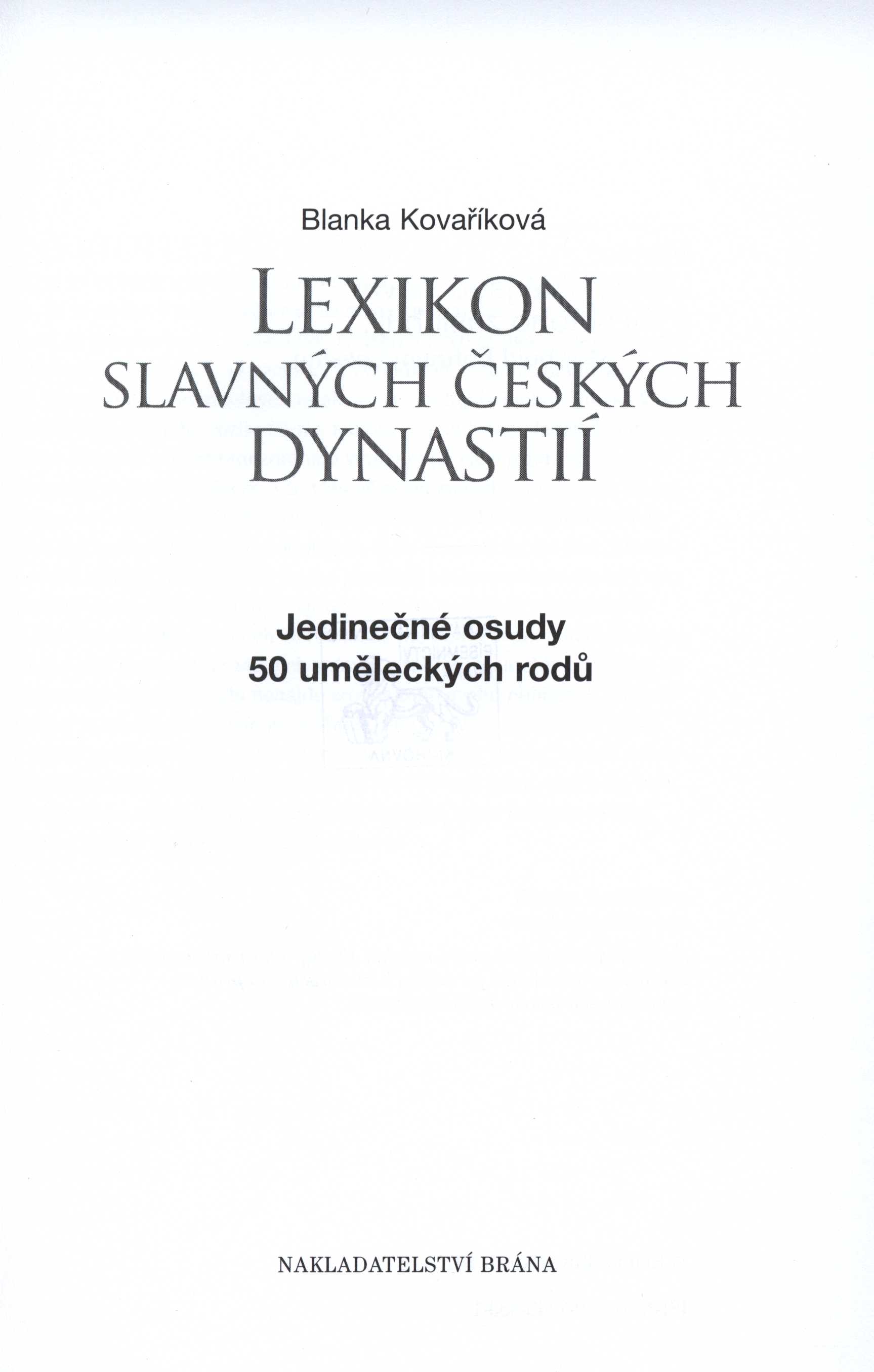 Title information Lexikon slavných českých dynastií : jedinečné osudy 50 uměleckých rodů / Blanka Kovaříková ; [obálka a grafická úprava Radomila Gaierová] Personal name Kovaříková, Blanka, 1961- (Author) Další autoři Gaierová, Radomila (Book designer) (Bookjacket designer) Edition statement Vyd. 1. Publication Praha : Brána, 2010 Manufacture Finidr) Scope 343 s. : il., portréty ; 24 cm ISBN 978-80-7243-483-1 (váz.) Country Czech Republic Language Czech Note Zdob. vazba a přídeští. -- Čb. portrétní fotografie. -- Obsahuje bibliografii.