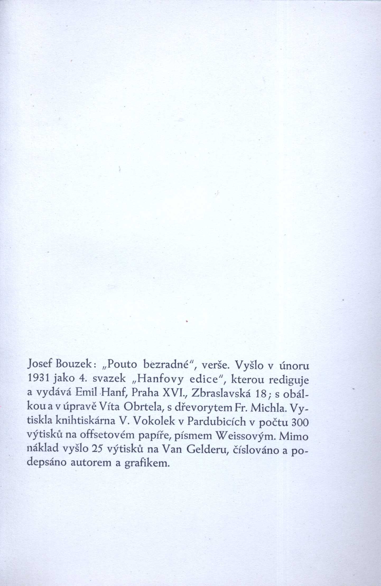 1. Title informationPouto bezradné : básně 1929-1930 / Josef Bouzek ; [s obálkou a v úpravě Víta Obrtela ; s dřevorytem Fr. Michla]