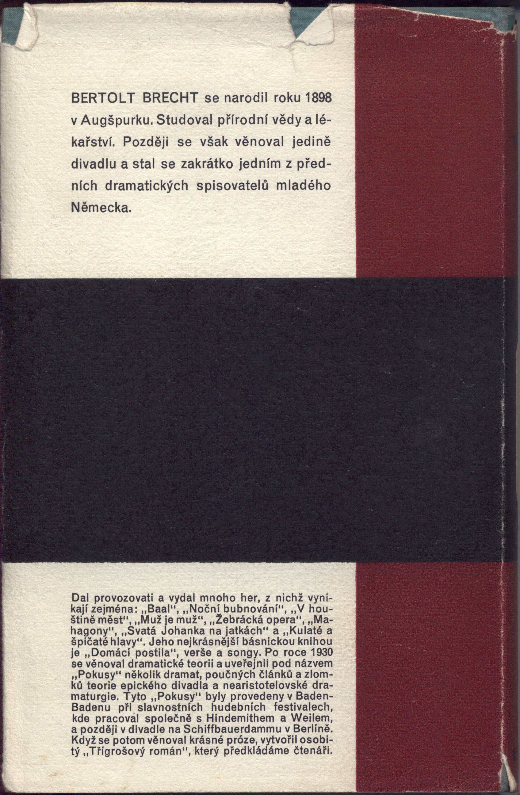 Document kind monografie Personal subjects Brecht, Bertolt, 1898-1956 - německý dramatik, básník, režisér, prozaik Keywords německá literatura * próza * překlad * román UDC 821.112.2 * 82-3 * 651.926 * 821.112.2-31 Uživatelské pole PNP U sign. ELK 0166 a ELK 0166a (stejné vázané výtisky) typizovaná, barevná, zdobená obálka (F. Muzika) se značkou nakladatelství. - Zelená plátěná vazba (flexovazba) s barevnou zdobenou ražbou (F. Muzika). - Na přední záložce upoutávka na knihu. - Černé předsádky. - Nakladatelská značka a razítko Archiv Čs. spisovatel, č. P 606. - Patitul. - Titulní list. - Výslovnost anglických jmen a slov. - Obsah. - Tiráž. - Na zadní straně zdobené obálky poznámka o autorovi. - Typizované kartonové pouzdro s nalepeným informačním štítkem a značkou jen u sign. ELK 0166. U sign. ELK 0166a chybí avizovaná obálka. Tiráž: "Bertolt Brecht: Třígrošový román. Z německé předlohy přeložil J. Zaorálek. Verše přeložil B. Mencák. Garmondem písma Bodoni vytiskla tiskárna Jiřího Jelena na Mělníce podle typografické úpravy J. Hesouna. Pro členy Evropského literárního klubu v Praze XVI, Přemyslova 16, vyšlo dne 24. dubna 1935. Vazba i ochranný obal jsou provedeny podle návrhu Františka Muziky." Rozsah: 345, [7] s. Rozměr knihy: 21,7 cm; rozměr pouzdra: 22,4 cm Originál Dreigroschenroman vyšel v roce 1934. Call number Track No. Location Info ELK 0166 0598/2013 Sbírka ELK 0166a 0599/2013 Sbírka