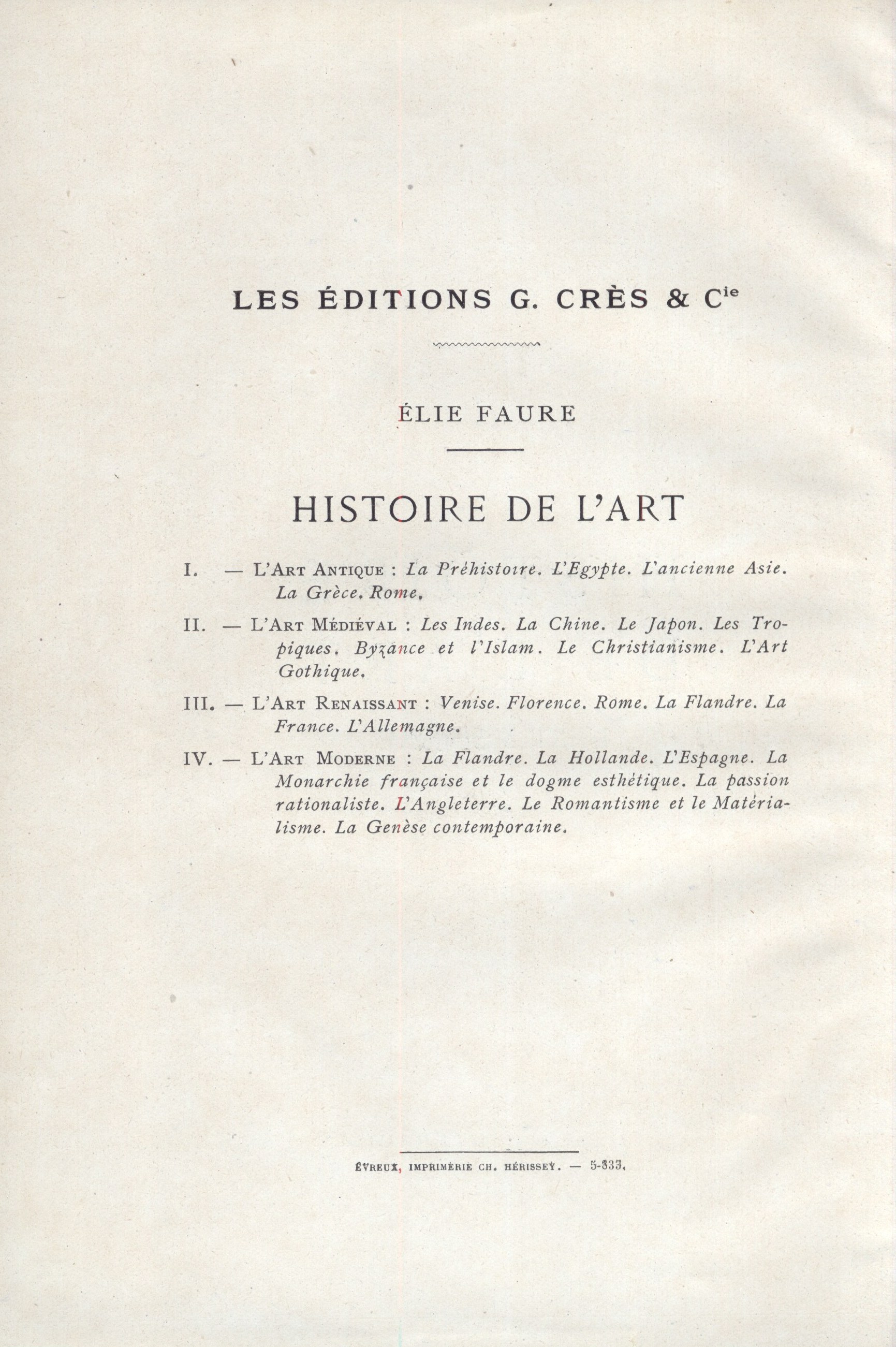 Title information Histoire de l'art / Élie Faure. [IV], L'Art moderne Personal name Faure, Élie, 1873-1937 (Author) Další autoři Georges Crès et Cie (Paris, Francie) (Publisher) Imprimerie de Charles Hérissey (tiskárna) (Printer) Další var.názvy L'Art moderne Edition statement Nouvelle édition, revue et augmentée Publication Paris : Les Éditions G. Crès & Cie, 1924 Manufacture Imprimerie Ch. Hérissey) Scope [10], xxiii, 512, [8] s. rozkl. tab. : il. ; 23 cm ISBN (váz.) Country France Language French Note Polokožená vazba. - Díly proti titulu a tiskárna. - Dvoubarevný titulní list. - Text francouzsky. - Úvod. - Předmluva. - Četné černobílé fotografie v textu, i celostránkové. - Abecední rejstřík. - Obsah. - Rozkládací tabulky. - Bez tiráže.