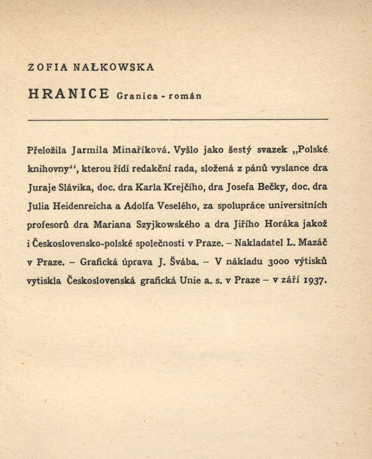 Title information Hranice : román / Zofia Nałkowska ; [přeložila z polštiny a závěrečnou poznámku napsala Jarmila Minaříková ; grafická úprava J. Švába] Personal name Nałkowska, Zofia, 1884-1954 (Author) Další autoři Minaříková, Jarmila, 1909- (Translator) Šváb, Jaroslav, 1906-1999 (Book designer) Corporation L. Mazáč (nakladatelství) (Publisher) Československá grafická unie (Printer) Publication V Praze : L. Mazáč, 1937 Manufacture (Československá grafická Unie) Scope 314 s. ; 8° ISBN (váz.) Edition Polská knihovna ; sv. 6