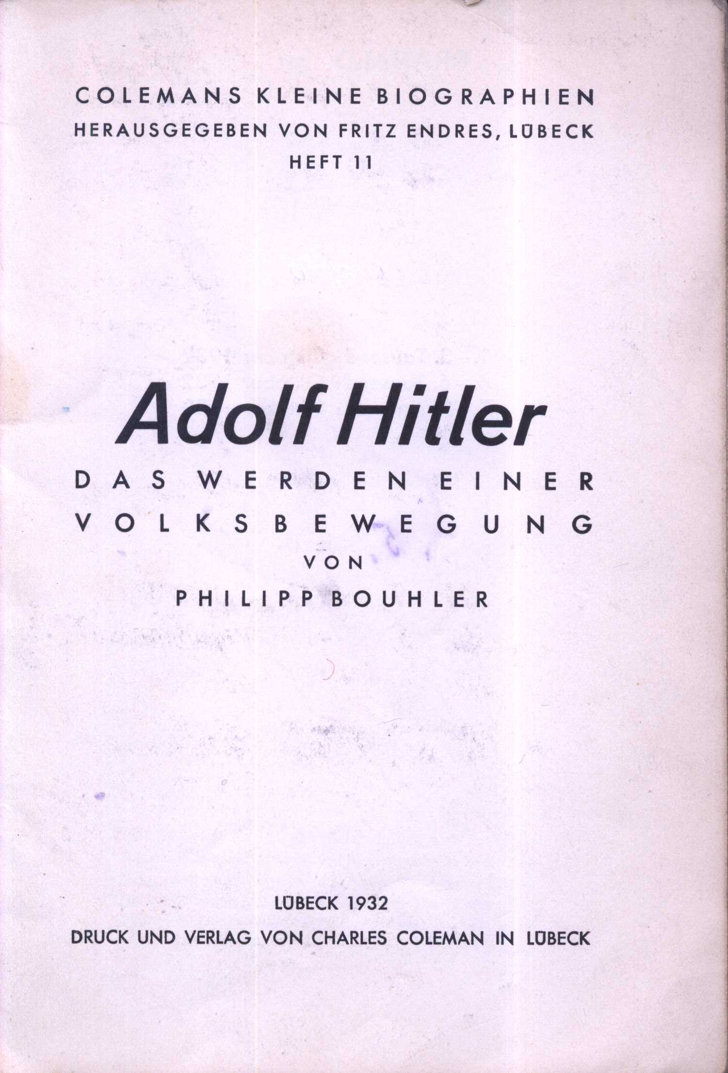 Title information Adolf Hitler : das Werden einer Volksbewegung / von Philipp Bouhler Personal name Bouhler, Philipp, 1899-1945 (Author) Publication Lübeck : Charles Coleman, 1932 Scope 48 stran ; 19 cm ISBN brožováno Edition Colemans kleine Biographien (Coleman) ; Heft 11