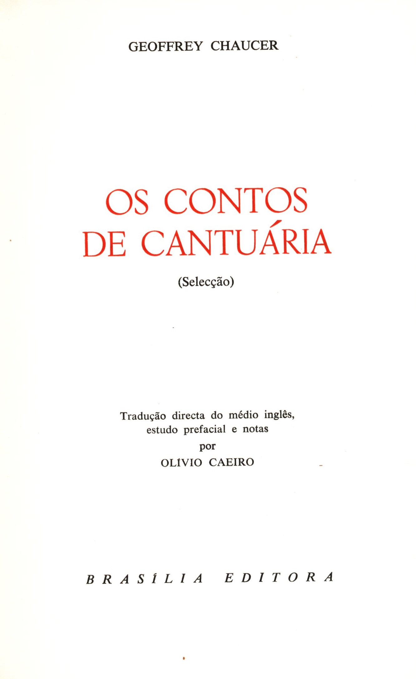 Title information Os Contos de Cantuária : (Selecção) / Geoffrey Chaucer ; tradução directa do médio inglês, estudo prefacial e notas por Olívio Caeiro Personal name Chaucer, Geoffrey, asi 1340-1400 (Author) Další autoři Caeiro, Olívio (Translator) (Author of introduction) (Commentator) Corporation Brasília Editora (Publisher) Tipografia Camões (Printer) Edition statement 1.a edição Publication Porto : Brasília Editora, 1980 Manufacture Póvoa de Varzim : Tipografia Camões Scope 216 stran ; 20 cm ISBN (Vázáno) Edition Colecção Poética (Brasília Editora)
