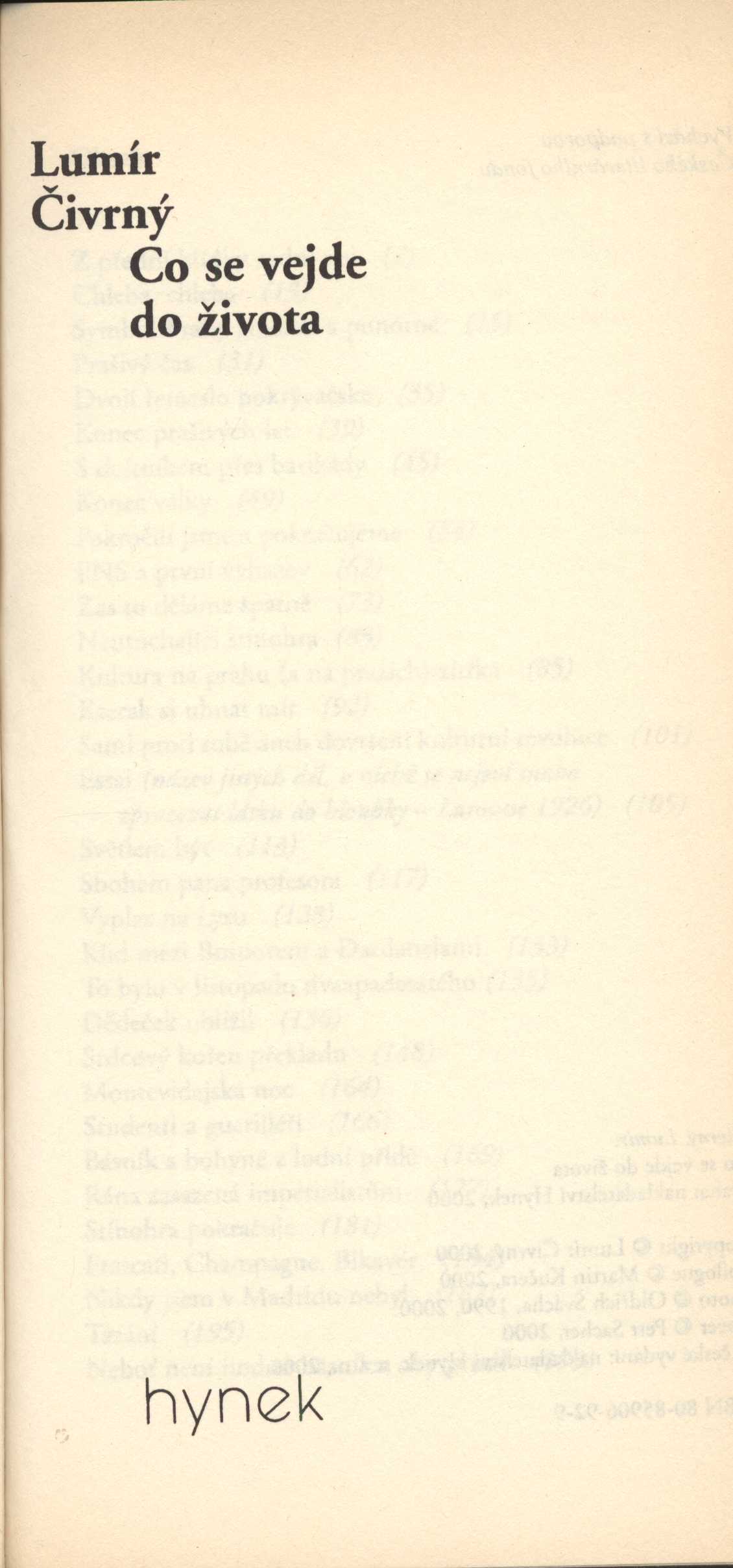 Title information Co se vejde do života / Lumír Čivrný ; [grafická úprava a redakce JDDP-Group ; přebal a vazba Petr Sacher] Personal name Čivrný, Lumír, 1915-2001 (Author) Další autoři Sacher, Petr, 1944- (Graphic technician) Kučera, Martin, 1958- (Author of afterword, colophon, etc.) Švácha, Oldřich (Photographer) Corporation Hynek (nakladatelství) (Publisher) Finidr (tiskárna) (Printer) Edition statement Vyd. 1. Publication Praha : Hynek, 2000 Manufacture (Finidr) Scope 252 s. ISBN 80-85906-92-9 (váz.) Edition Imago sv. 6