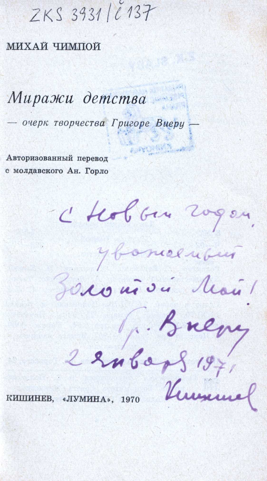 Document kind monografie Personal subjects Vieru, Grigore, 1935-2009 - rumunský básník a spisovatel z Moldavska Keywords básníci * spisovatelé * Moldavsko * Moldavská SSR * stol. 20. * život a dílo * básnická tvorba * tvorba pro děti * rozbor díla * monografie UDC 808.1-051 * (470+571) * 821-93 * 82-1 * 82-95 * 929 Uživatelské pole PNP V obou výtiscích věnování Gr. Vieru Zdeňkovi Slabému s datací (1971). - Knihovna Z.K. Slabého. Call number Track No. Location Info ZKSlabý 0901 0298/2011 Sbírka ZKSlabý 0901a 0299/2011 Sbírka