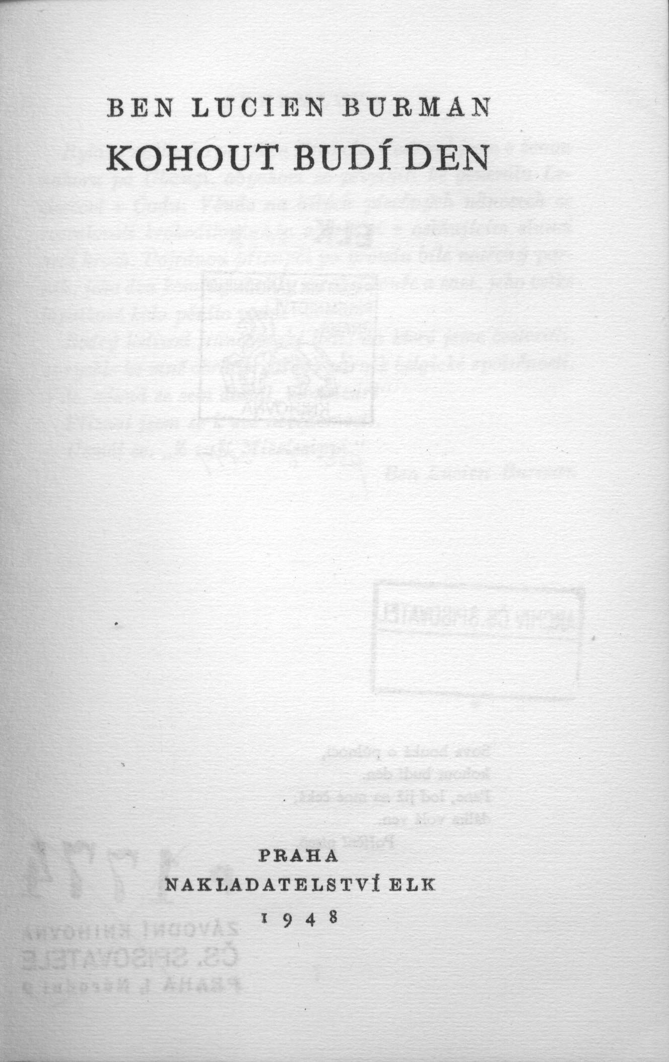 Title information Kohout budí den : [román] / Ben Lucien Burman ; [z anglického originálu ... přeložila Bojana Kautecká a Jan Mádl ; doslov napsal Edvard Valenta ; [tisk] podle typografické úpravy Oldřicha Menharta, který také navrhl obálku] Personal name Burman, Ben Lucien, 1896-1984 Další autoři Kautecká, Bojana (Translator) Mádl, Jan, 1903- Valenta, Edvard, 1901-1978 (Author of afterword, colophon, etc.) Menhart, Oldřich, 1897-1962 (Typographer) (Bookjacket designer) Corporation Evropský literární klub (nakladatelství) (Publisher) Dr. Ed. Grégr a syn (nakladatelství, tiskárna) (Printer) Publication Praha : nakladatelství ELK, 1948 Manufacture (dr. Ed. Grégr a syn) Scope 253 s. ; 18 cm ISBN brož. Edition Edice Život. výběrová řada svazek 13