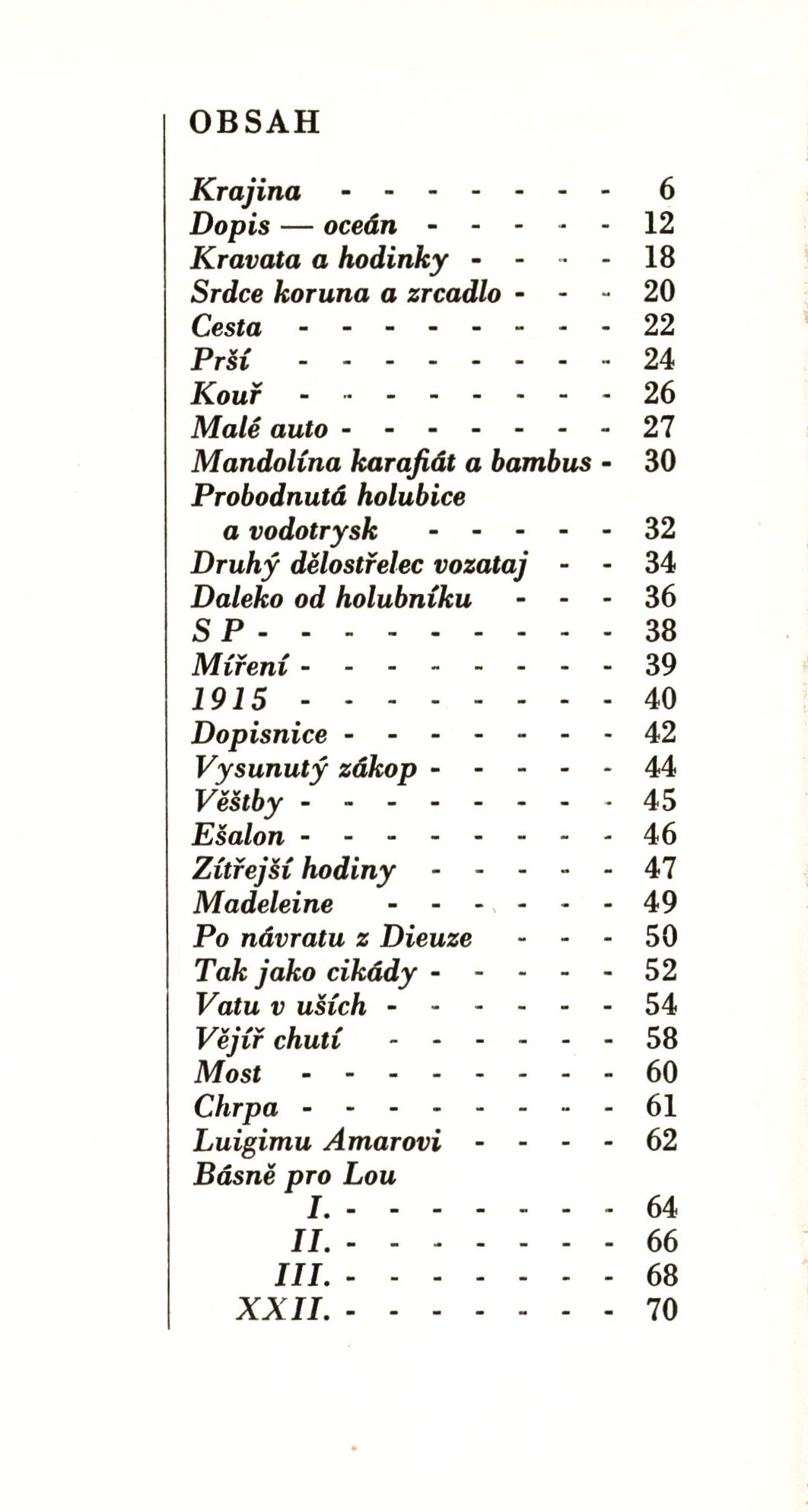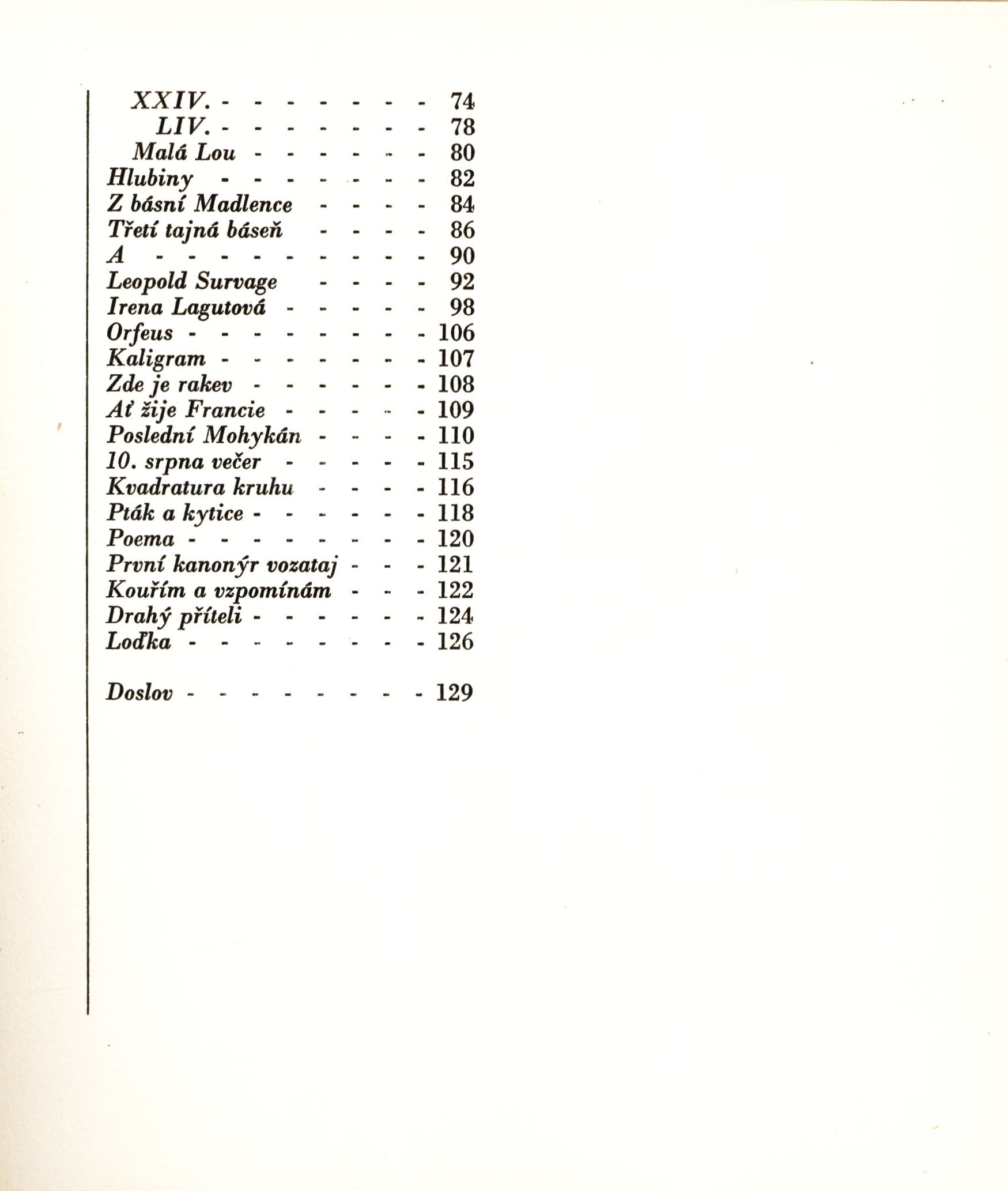 Title information Básně, obrazy / Guillaume Apollinaire ; z francouzského originálu ... vybral a přeložil Jiří Konůpek ; doslov napsal a ilustrační materiál sestavil Vladimír Diviš ; přebal, obálku, předsádky a grafickou úpravu navrhl Oldřich Hlavsa Personal name Apollinaire, Guillaume, 1880-1918 (Author) Další autoři Konůpek, Jiří, 1919-1968 (Translator) (Compiler) Diviš, Vladimír (Author of afterword, colophon, etc.) (Compiler) Hlavsa, Oldřich, 1909-1995 (Book designer) (Graphic technician) Corporation Státní nakladatelství krásné literatury a umění (Publisher) Polygrafia (tiskárna, Praha) (Printer) Edition statement Vydání 1. Publication Praha : Státní nakladatelství krásné literatury a umění, 1965 Manufacture Praha : Polygrafia 3, n. p. Copyright notice date ©1957 Scope 127 stran : koláže z písmen, kaligramy, ilustrace ; 18 cm ISBN (vázáno) Country Czech Republic Language Czech Language of the original French Note Zdobená typografická obálka a vazba. - Barevné předsádky. - Ilustrovaný frontispis. - Dvoubarevný text na titulním listu. - Obsah. - Básně v obrazcích, kaligramy. - Doslov. - Tiráž. - Přebal.