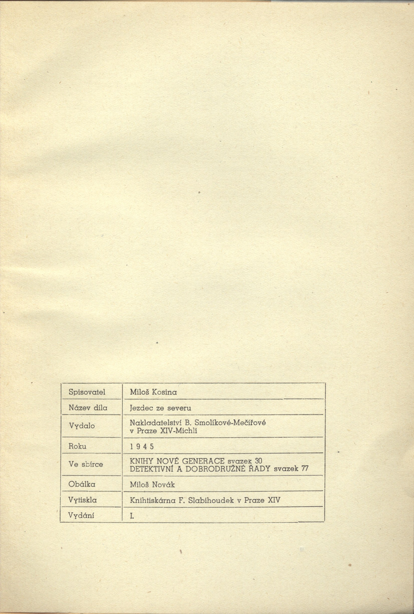 Tiráž: "Spisovatel: Miloš Kosina. Název díla: Jezdec ze severu. Vydalo: Nakladatelství B. Smolíkové-Mečířové v Praze XIV-Michli. Roku: 1945. Ve sbírce: Knihy nové generace svazek 30; detektivní a dobrodružné řady svazek 77. Obálka: Miloš Novák. Vytiskla: Knihtiskárna F. Slabihoudek v Praze XIV. Vydání: I."