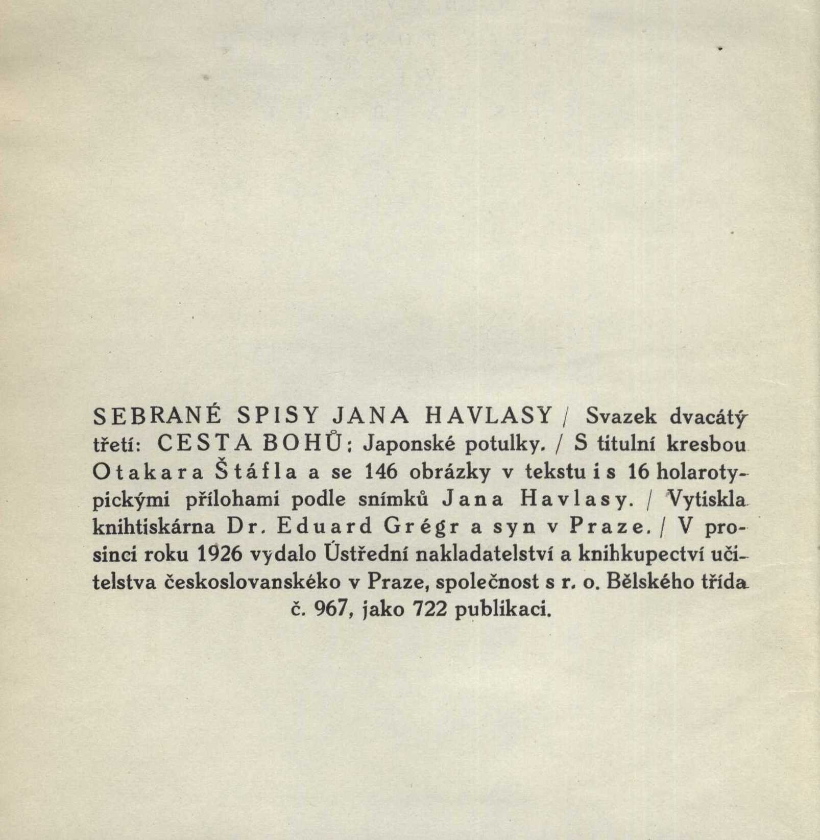 Title information Cesta bohů : [japonské potulky : 1912 - 1926] / Jan Havlasa ; [s titulní kresbou Otakara Štáfla ; a se 146 obrázky v tekstu [sic] i s 16 holarotypickými přílohami podle snímků Jana Havlasy] Personal name Havlasa, Jan, 1883-1964 (Author) (Photographer) Další autoři Štáfl, Otakar, 1884-1945 (Illustrator) Corporation Ústřední nakladatelství a knihkupectví učitelstva českoslovanského (Praha, Česko) (Publisher) Dr. Ed. Grégr a syn (nakladatelství, tiskárna) (Printer) Publication V Praze : Ústřední nakladatelství a knihkupectví učitelstva českoslovanského, 1926 Manufacture (Dr. Eduard Grégr a syn) Scope 410 s., [16] obr. příl. : il. ; 24 cm ISBN (váz.) Edition Sebrané spisy Jana Havlasy sv. 23