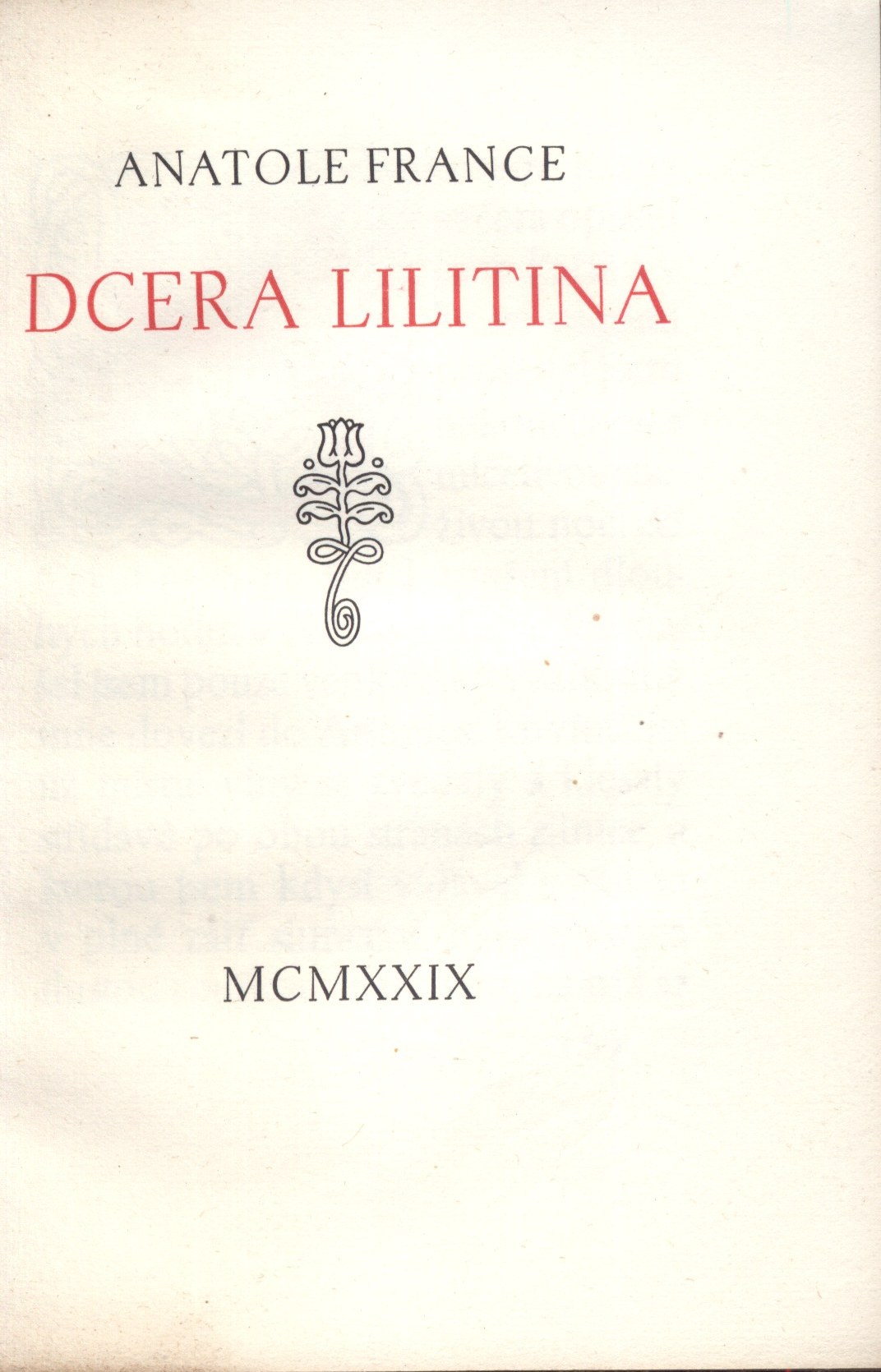 Title information Dcera Lilitina / Anatole France ; z francouzštiny přeložil Karel Dyrynk a knížku také vyzdobil i typograficky upravil Personal name France, Anatole, 1844-1924 (Author) Další autoři Dyrynk, Karel, 1876-1949 (Translator) (Book designer) (Illustrator) (Typographer) (Binding designer) (Publisher) Corporation Státní tiskárna v Praze (Printer) Publication 1929 [V Praze] : Karel Dyrynk, 1929 Manufacture (Státní tiskárna) Scope 42 stran ; 15 cm + 1 list novoročenky ISBN (vázáno) Country Czech Republic Language Czech Language of the original French Note Polokožená vazba se zdobeným zlaceným hřbetem. - Vložené novoroční přání nakladatele. - Červený a černý tisk knihy. - Titulní list zdobený vinětou. - Zdobná úvodní iniciála. - Tiráž zdobena vinětou.