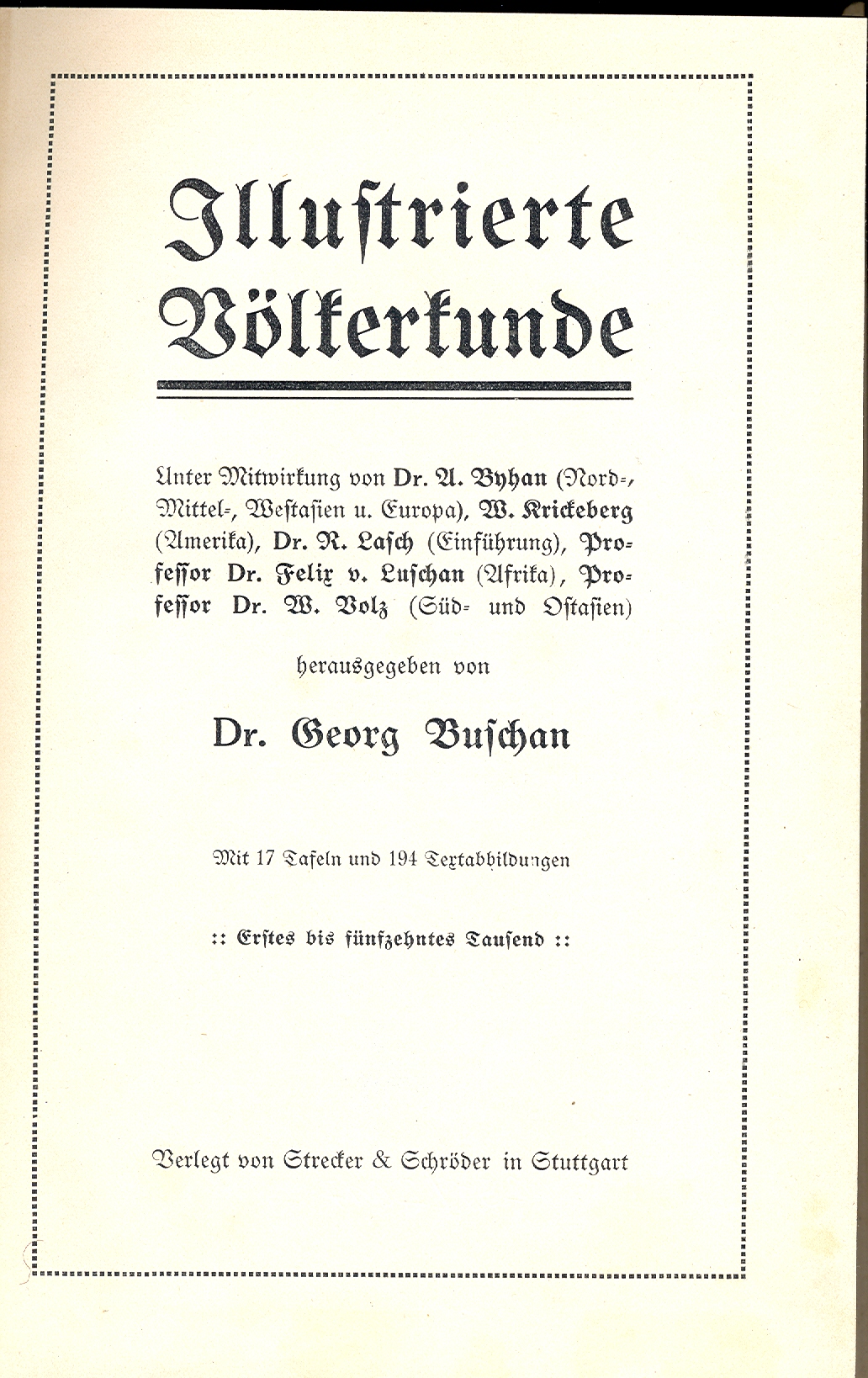 Title information Illustrierte Völkerkunde / unter Mitwirkung von A. Byhan (Nort-, Mittel-, Westasien u. Europa), W. Krickeberg (Amerika), R. Lasch (Einführung), Felix v. Luschan (Afrika), W. Volz (Süd- und Ostasien) ; herausgegeben von Georg Buschan Personal name Buschan, Georg, 1863-1942 (Compiler) Další autoři Byhan, Arthur, 1872- (Author) Krickeberg, Walter, (Author) 1885-1962 Lasch, Richard, 1866-1936 (Author) Luschan, Felix von, 1854-1924 (Author) Volz, Wilhelm, 1870-1958 (Author) Corporation Strecker und Schröder (nakladatelství a tiskárna) (Publisher) Publication In Stuttgart : Verlegt von Strecker & Schröder, ©1910 Scope xiv, 464 stran, XVI stran obrazových příloh : ilustrace ; 22 cm. Country Germany Language German Note Frontispis. - Černobílé kresby a fotografie. - Obsahuje bibliografické odkazy a rejstříky.