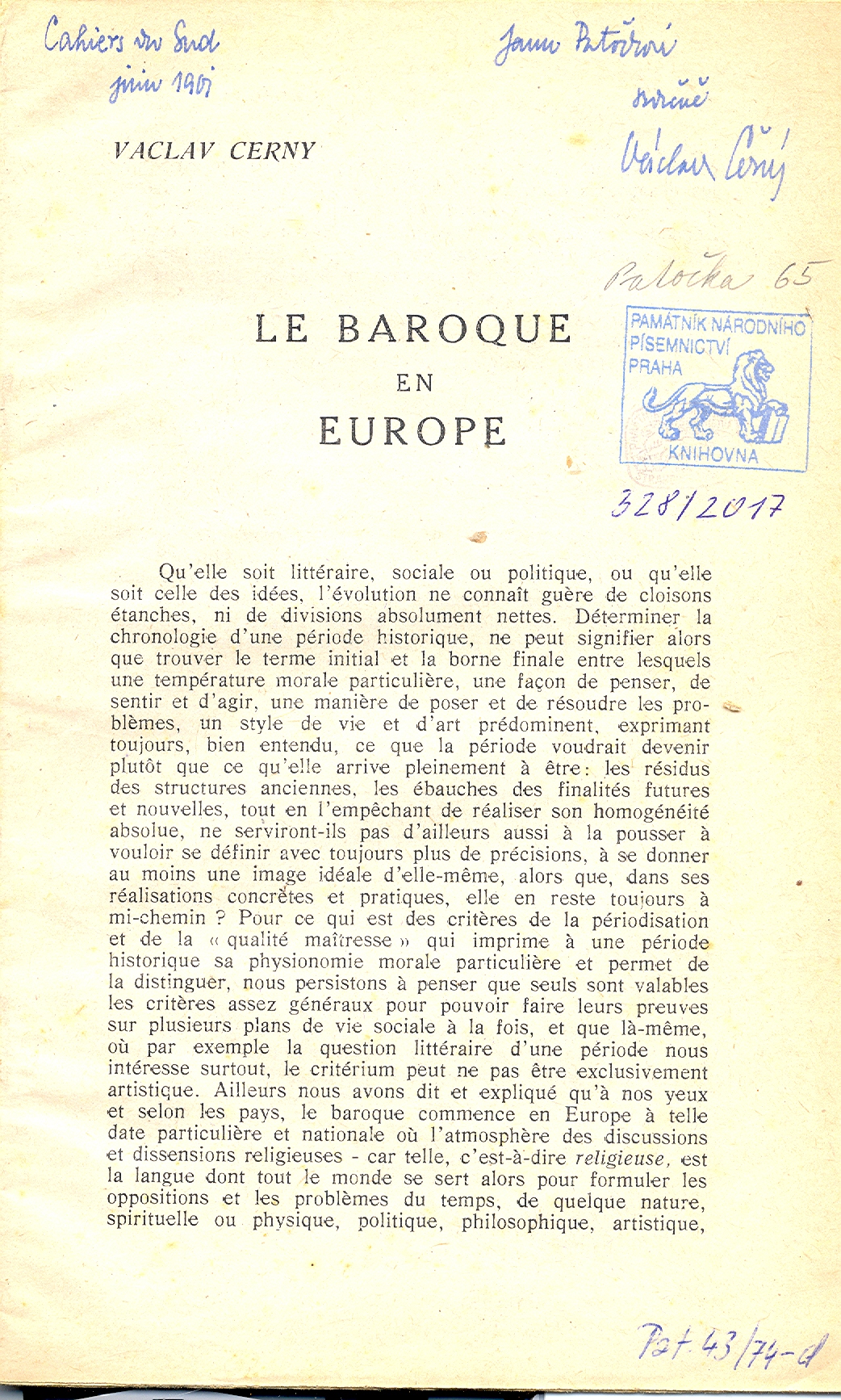 Title information Le baroque en Europe / Vaclav Cerny Personal name Černý, Václav, 1905-1987 (Adapter) (Dedicator) Další autoři Patočka, Jan, 1907-1977 (Dedicatee) Publication [1901] Scope Strany 406-426 ; 22 cm ISBN (Sešito) Country France Language French Note Separát z: Cahiers du Sud, juin 1901. - Název z obálky.