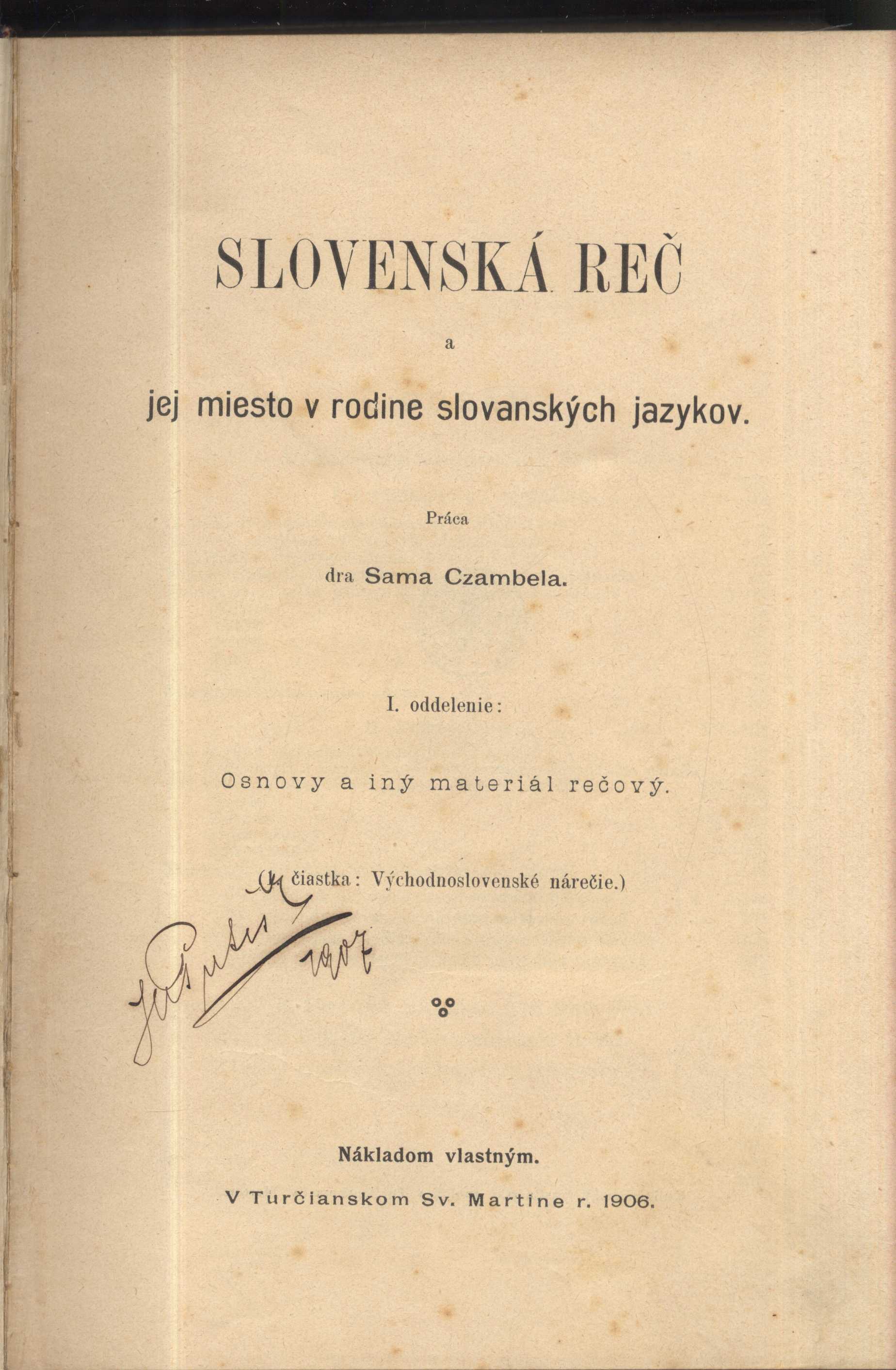 Title information Slovenská reč a jej miesto v rodine slovanských jazykov. I. oddelenie, Osnovy a iný materiál rečový. 1. čiastka, Východnoslovenské nárečie / práca dra Sama Czambela Personal name Cambel, Samuel, 1856-1909 (Author) Další autoři Kníhtlačiarsky účastinársky spolok (Turčiansky Sv. Martin, Slovensko) (Printer) Další var.názvy Osnovy a iný materiál rečový. Východnoslovenské nárečie Publication V Turčianskom Sv. Martine : nákladom vlastným, 1906 Manufacture Kníhtlačiarsky účastinársky spolok Scope v, 624 stran ; 25,5cm ISBN (vázáno) Country Slovakia Language Slovak Note Typografická obálka. - Přehled vydaných knih autora. - Poznámky pod čarou. - Bibliografické údaje. - Rečové ukážky (záznamy nářečních textů). - Slovníkové svojskosti (slovník).