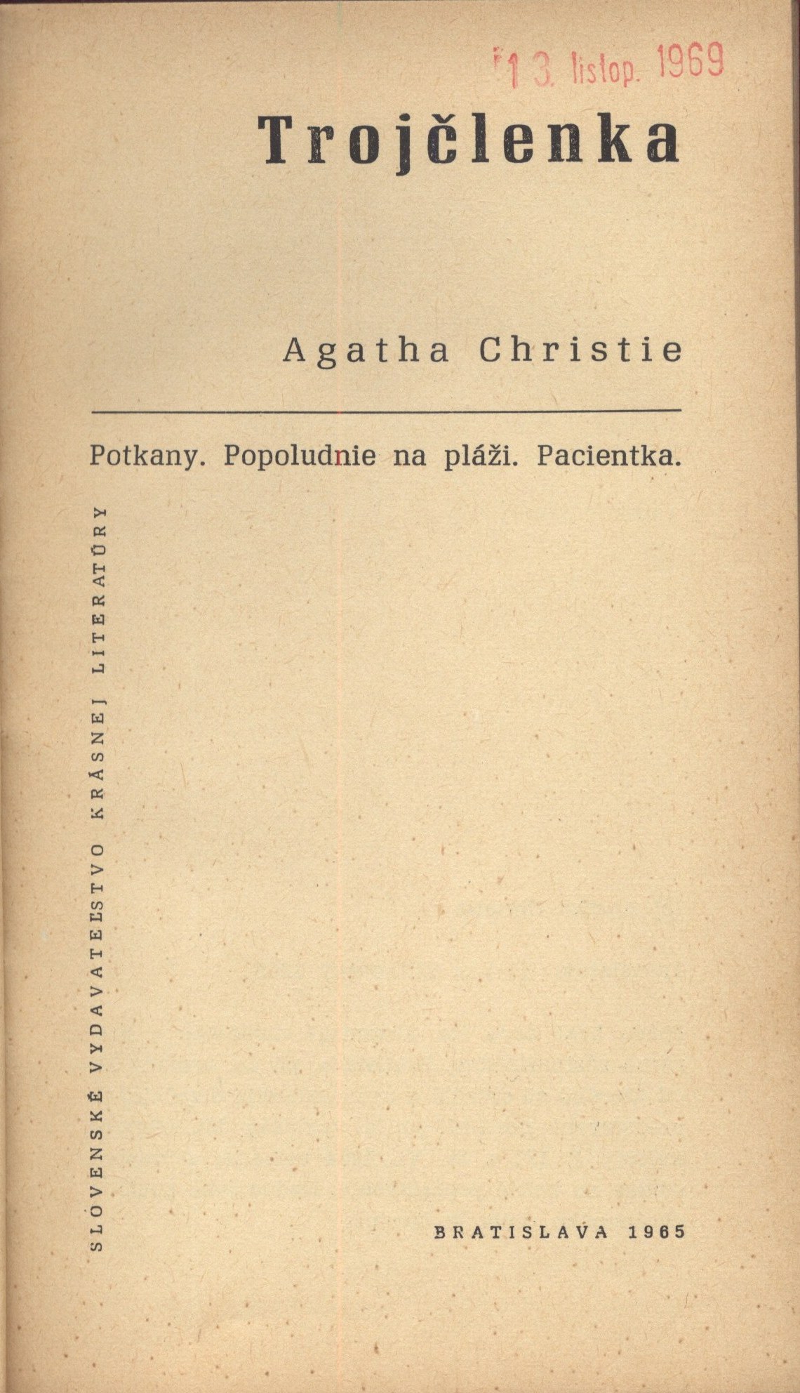 Title information Trojčlenka. Potkany. Popoludnie na pláži. Pacientka / Agatha Christie ; preložil Ján Vilikovský Personal name Christie, Agatha, 1890-1976 (Author) Další autoři Vilikovský, Ján, (Translator) 1937- Škvorecký, Josef, 1924-2012 (Author of afterword, colophon, etc.) Nemsilová, Emília, 1932- (Translator) Dolinská, Dagmar (Bookjacket designer) (Binding designer) Corporation Slovenské vydavateľstvo krásnej literatúry (Publisher) Tlačiarne Slovenského národného povstania (tiskárna) (Printer) Další var.názvy Potkany Popoludnie na pláži Pacientka Edition statement Prvé vydanie Publication Bratislava : Slovenské vydavateľstvo krásnej literatúry, 1965 Manufacture Bánská Bystrica : Tlačiarne SNP, n. p., Martin Scope 137 stran ; 18 cm ISBN (Vázáno) Edition Edícia divadelných hier ; 94. zväzok