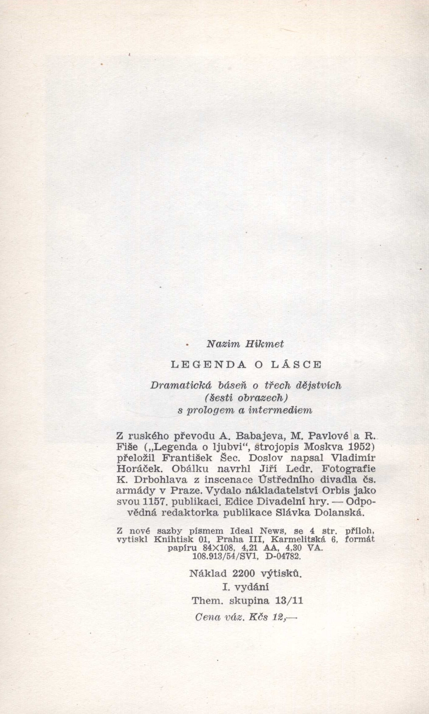 Title information Legenda o lásce : dramatická báseň o třech dějstvích (šesti obrazech) s prologem a intermediem / Nazim Hikmet ; z ruského převodu A. Babajeva, M. Pavlové a R. Fiše Legenda o ljubvi ... přeložil František Šec Personal name Hikmet Ran, Nazim, 1902-1963 (Author) Další autoři Šec, František, 1919- (Translator) Horáček, Vladimír, 1922-1998 (Author of afterword, colophon, etc.) Ledr, Jiří, 1921- (Bookjacket designer) Drbohlav, Karel, 1908-1971 (Photographer) Corporation Orbis (firma) (Publisher) Knihtisk (tiskárna) (Printer) Edition statement I. vydání Publication Praha : Orbis, 1955 Manufacture Praha : Knihtisk 01 Scope 83 stran, 4 nečíslované strany obrazové přílohy : ilustrace, fotografie ; 21 cm ISBN (Vázáno) Edition Edice Divadelní hry