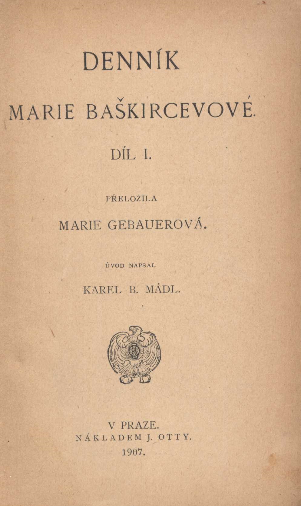 Title information Denník Marie Baškircevové. Díl I. / přeložila Marie Gebauerová ; úvod napsal Karel B. Mádl Personal name Baškirceva, Marija Konstantinovna, 1860-1884 (Author) Další autoři Gebauerová, Marie, 1869-1928 (Translator) Mádl, Karel Boromejský, 1859-1932 (Author of introduction) Corporation J. Otto (nakladatelství) (Publisher) Unie (tiskárna) (Printer) Další var.názvy Denník Publication V Praze : nákladem J. Otty, 1907 Manufacture V Praze : tiskem Unie Scope viii, 508 stran, 1 nečíslovaný list obrazové přílohy : ilustrace ; 15 cm ISBN (Vázáno) Edition Světová knihovna ; č. 560-565