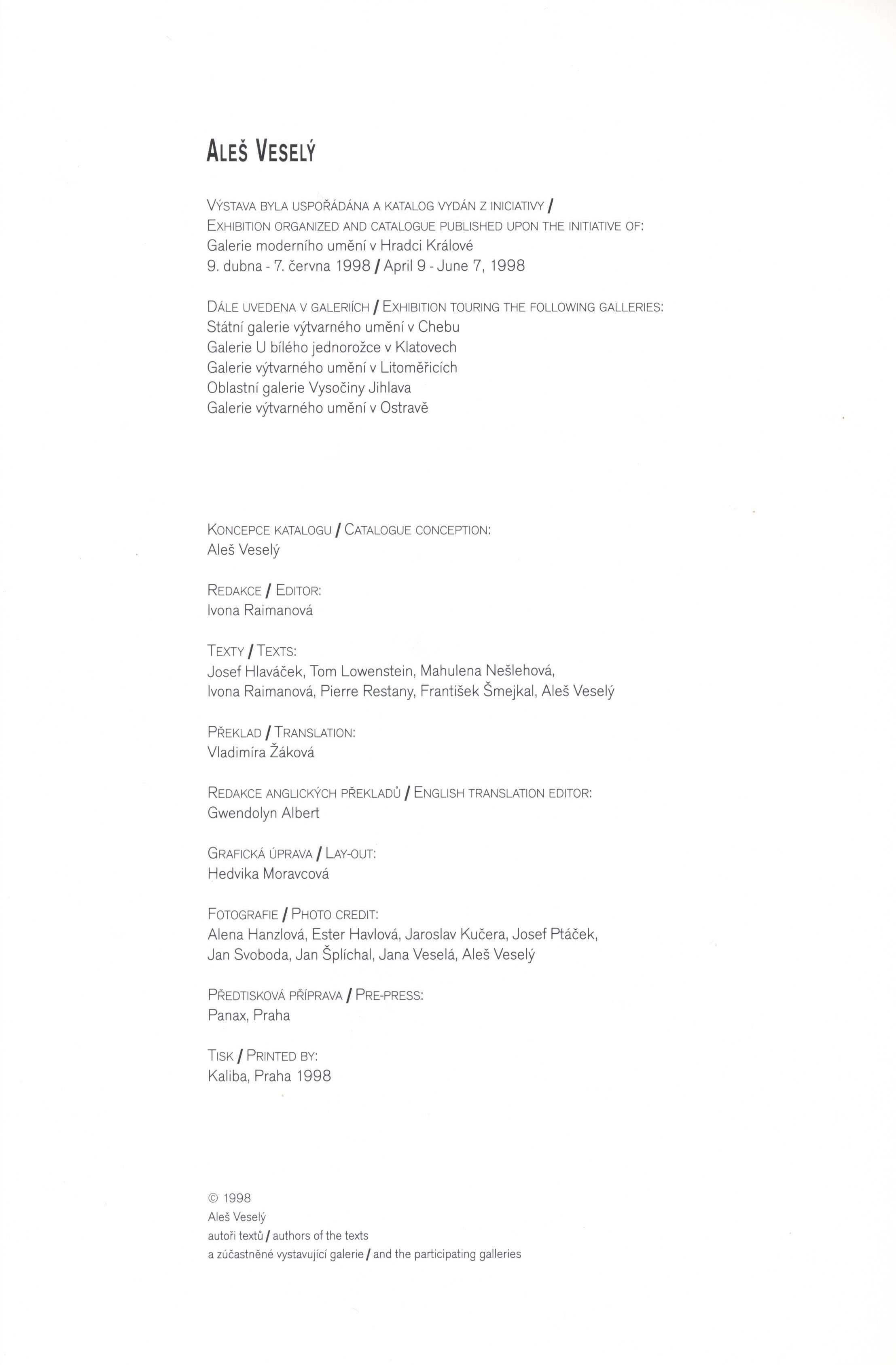 Title information Aleš Veselý : obsese, realita, utopie : 1998 : Galerie moderního umění v Hradci Králové, 9. dubna - 7.června 1998 / koncepce katalogu Aleš Veselý ; texty Josef Hlaváček, Tom Lowenstein, Mahulena Nešlehová, Ivona Raimanová, Pierre Restany, František Šmejkal, Aleš Veselý ; překlad Vladimíra Žáková ; grafická úprava Hedvika Moravcová Personal name Veselý, Aleš, 1935-2015 (Bibliographic antecedent) (Author of introduction) (Author) (Photographer) Další autoři Lowenstein, Tom, 1941-2025 (Author) Hlaváček, Josef, 1934-2008 (Author) Nešlehová, Mahulena, 1944- (Author) Raimanová, Ivona, 1956- (Author) Restany, Pierre, 1930-2003 (Author) Šmejkal, František, 1937-1988 (Author) Šefranka Žáková, Vladimíra, 1961- (Translator) Moravcová, Hedvika (Book designer) Corporation Galerie moderního umění (Hradec Králové, Česko) (Publisher) (Other) Tiskárna Kaliba (Printer) Publication Hradec Králové : Galerie moderního umění, 1998 Manufacture Praha : Kaliba Scope 64 nečíslovaných stran : ilustrace, fotografie ; 30 cm ISBN 80-85025-18-3 (v knize neuvedeno ; brožováno) Country Czech Republic Language Czech * English Language of the original Czech Note Obálka s barevnou fotografií, černý text. - Úvodní báseň autora. - Texty. - Černobílé a barevné fotografie, ilustrace, kresby s popisky (některé složené). - Průsvitné listy s textem. - Přehled tvorby. - Biografie autora, chronologie. - Barevné foto autora.