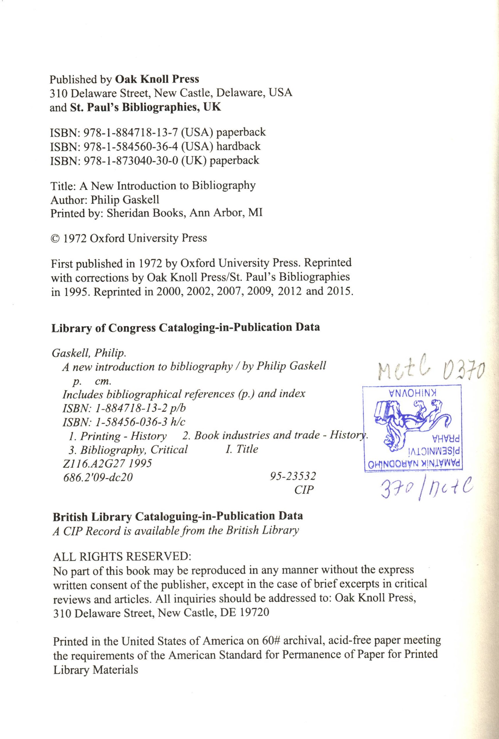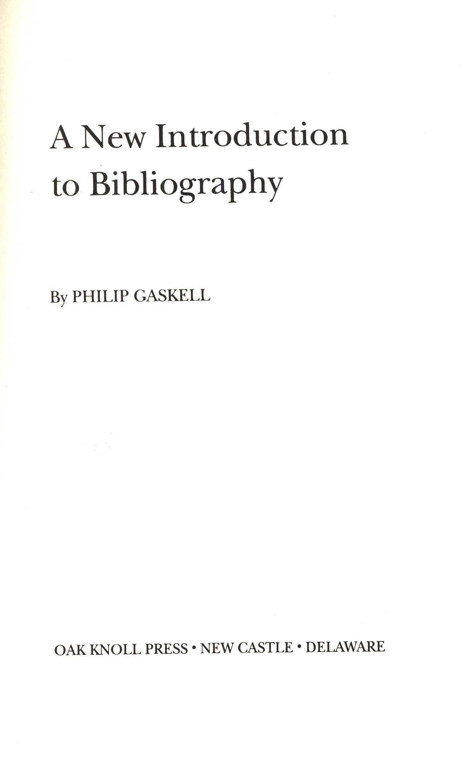 Title information A new introduction to bibliography / by Philip Gaskell Personal name Gaskell, Philip, (Author) 1926-2001 Další autoři Oak Knoll Press (Publisher) Publication New Castle: Delaware : Oak Knool Press, 1995 Scope 438 stran : černobílé ilustrace ; 23 cm ISBN 1-884718-13-2 (brožováno ; Oak Knool) 1-58456-036-3 (vázáno ; Oak Knool) 1-873040-30-X (brožováno ; St. Paul's Bibliographies) Country United States Language English Note Zdobená obálka. - Frontispis. - Na rubu titulní strany uveden jako nakladatel také St. Paul's Bibliographies. - Tištěno v USA