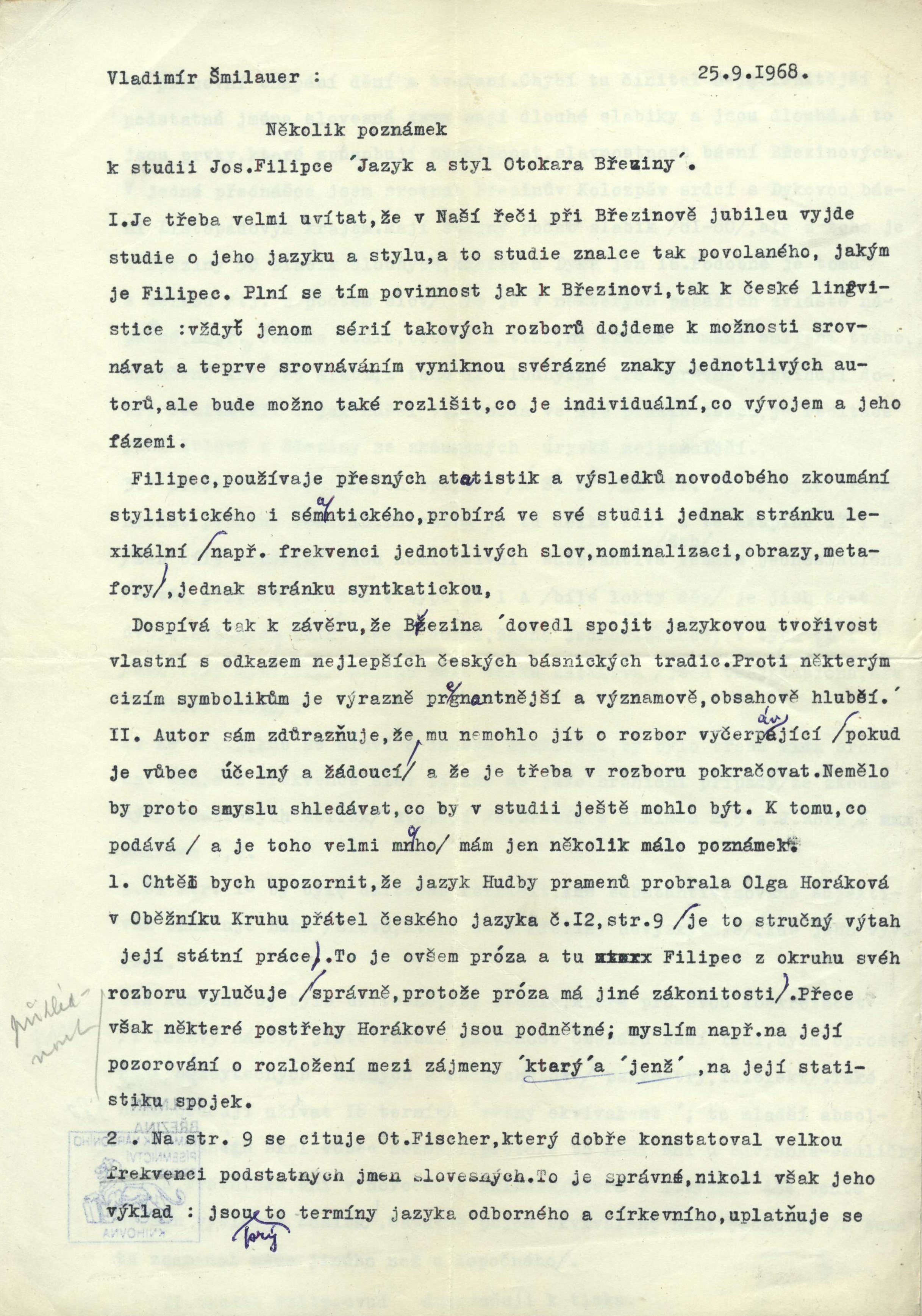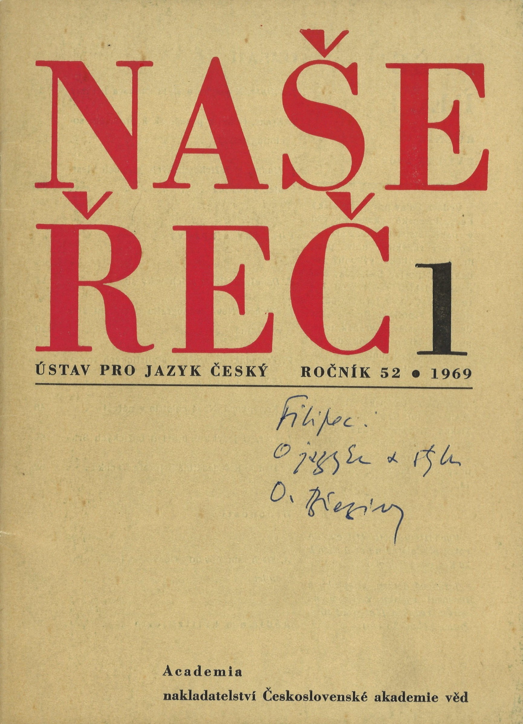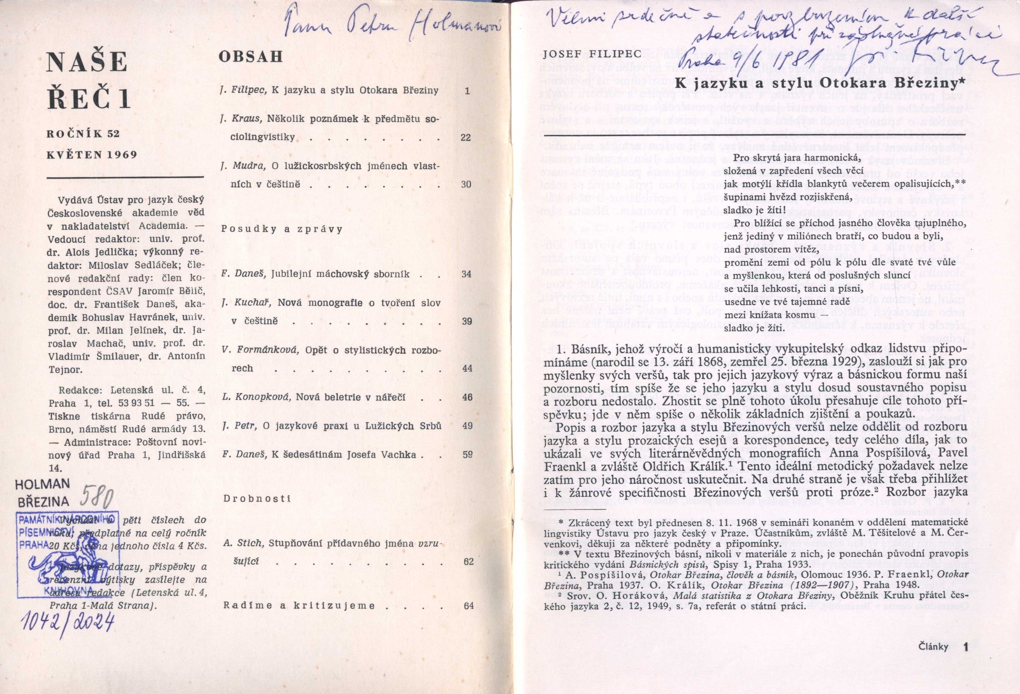 Poznámka o dalších původcích Vedoucí redaktor Alois Jedlička. - Výkonný redaktor Miloslav Sedláček Document kind PERIODIKA - Svázaný ročník periodika Periodicita 5x ročně Parent Naše řeč Keywords český jazyk * jazyková kultura * lingvistika * gramatika * slovní zásoba * r. 1969 * odborný časopis UDC 811.162.3 * (042.5) * 8 * 81`36 Uživatelské pole PNP Sign. Q6 B10: vazba ; kompletní ročník Sign. Holman-Březina 580: Knihovna Petra Holmana. - Pouze č. 1. - Na obálce rukopisná poznámka Petra Holmana. - Na s. 1-22 článek Josefa Filipce "K jazyku a stylu Otokara Březiny". - Na rubu přední strany obálky a na s. 1 rukopisná dedikace Josefa Filipce Petru Holmanovi s podpisem a datací. - Volně vloženy 2 listy strojopisu článku Vladimíra Šmilauera "Několik poznámek k studii Jos. Filipce Jazyk a styl Otokara Březiny" s korekturními vpisky a podpisem.