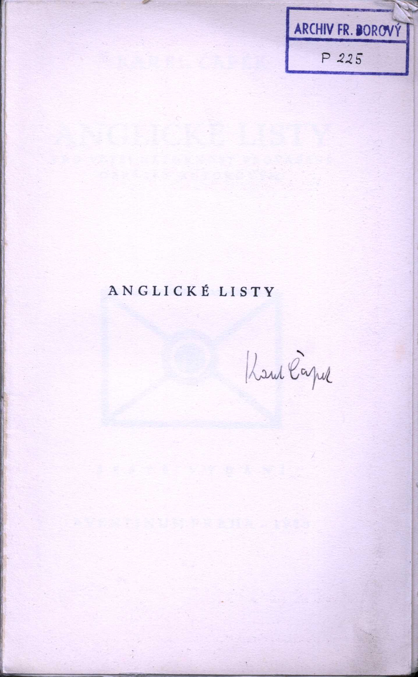 Title information Anglické listy : pro větší názornost provázené obrázky autorovými / Karel Čapek ; [v úpravě Josefa Čapka] Personal name Čapek, Karel, 1890-1938 (Author) (Illustrator) Další autoři Čapek, Josef, 1887-1945 (Book designer) (Bookjacket designer) Corporation Aventinum (nakladatelství) (Publisher) František Obzina (tiskárna, nakladatelství) (Printer) Edition statement 6. vyd. Publication Praha : Aventinum, 1928 Manufacture František Obzina) Scope 106 s. : il. ; 8° ISBN brož. Edition Aventinum sv. 91