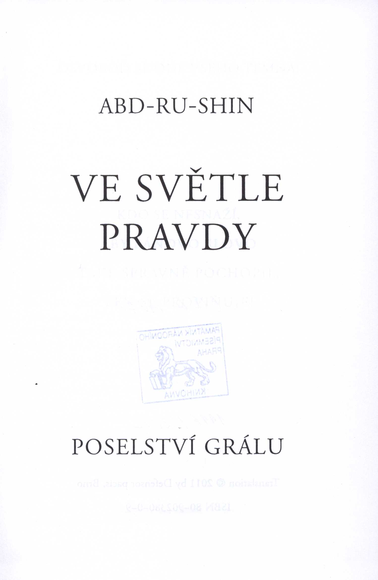 - Title information - Ve světle pravdy : poselství Grálu / Abd-ru-shin - Author - Abd-ru-shin, 1875-1941 (Author) - Další var.názvy - Poselství Grálu - Publication - Brno : Defensor pacis, 2011 - Scope - 1062 s. + 1 CD - ISBN - 978-80-902380-0-8 (váz.) - Country - Czech Republic - Language - Czech - Language of the original - German - Note - Přeloženo z němčiny. - Na záložkách přebalu poznámka o knize a autorovi.