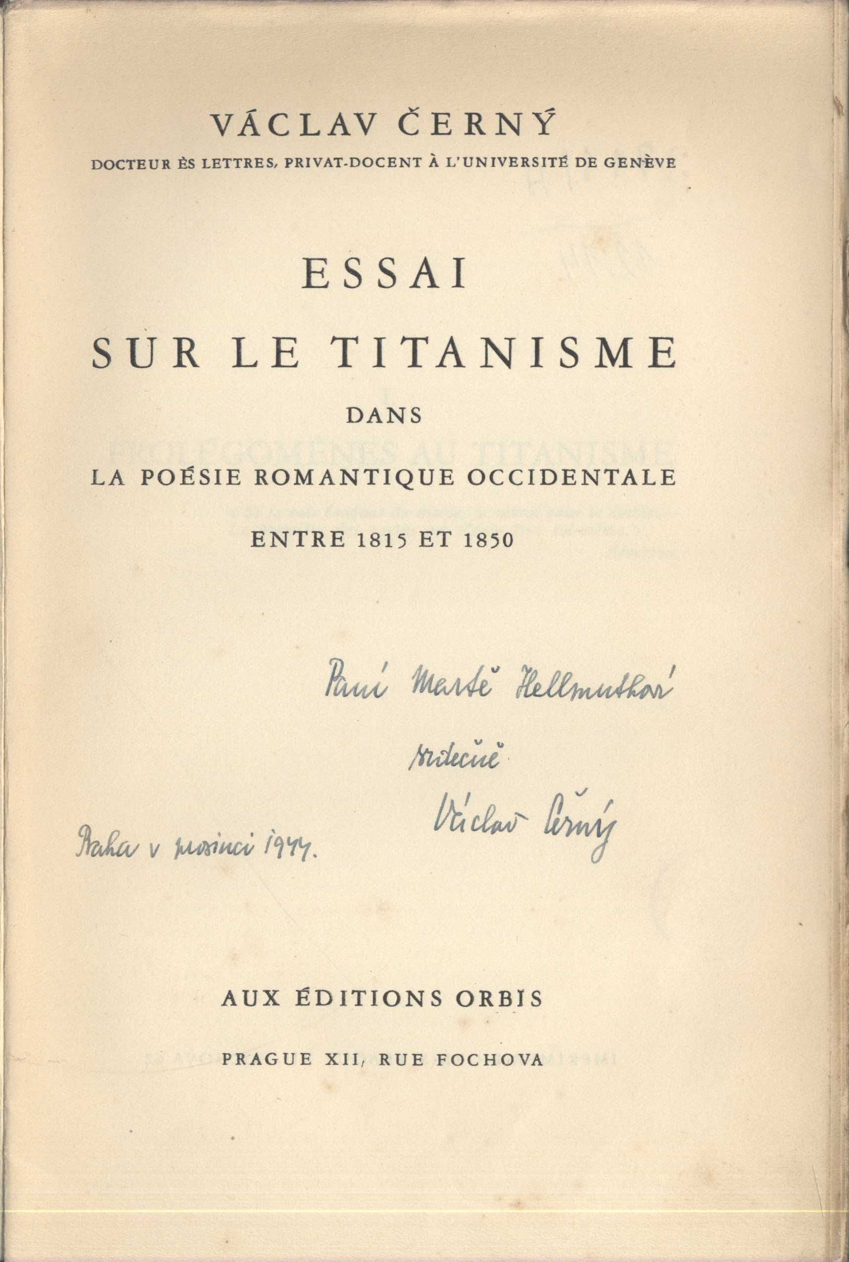 Title information Essai sur le titanisme dans la poésie romantique occidentale entre 1815 et 1850 / Václav Černý Personal name Černý, Václav, 1905-1987 (Author) (Dedicator) Další autoři Hellmuthová, Marta, 1917-1988 (Former owner) (Dedicatee) Corporation Orbis (tiskárna) (Publisher) Publication Prague : Orbis, 1935 Scope 437 s. ISBN brož. Country Czech Republic Language French Note Bibliografické údaje. - Poznámky pod čarou.