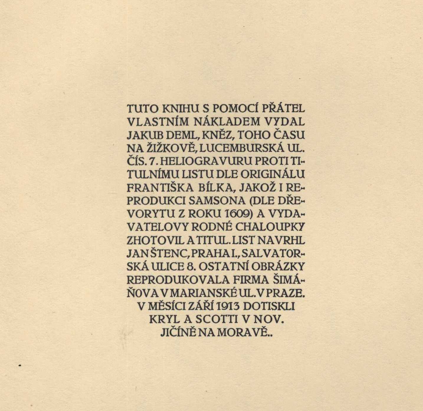Note Béžové desky se zlaceným tiskem na hřbetě. - Frontispis. - Dvojbarevný tisk titulního listu (červený a černý) s ilustrací. - Černobílé viněty na začátcích a koncích kapitol reprodukovala firma Šimáňova. - Na nestránkované příloze černobílá celostránková fotografie.