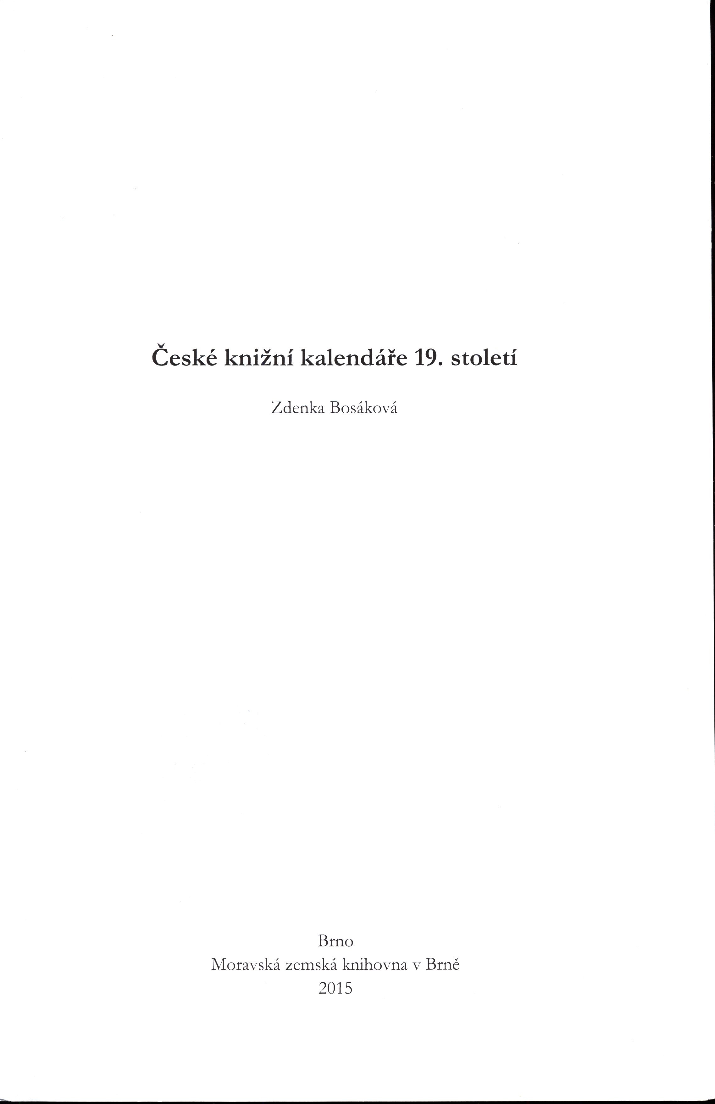 Title information České knižní kalendáře 19. století / Zdenka Bosáková Personal name Bosáková, Zdenka, 1980- (Author) Další autoři Heilandová, Lucie, 1980- (Bookjacket designer) Pavelková, Jindra, 1980- (Graphic technician) Corporation Moravská zemská knihovna (Brno, Česko) (Publisher) Tribun EU (firma) (Printer) Edition statement 1. vydání Publication Brno : Moravská zemská knihovna v Brně, 2015 Manufacture Tribun EU Scope 495 stran : ilustrace, faksimile ; 30 cm ISBN 978-80-7051-206-7 (brožováno) Country Czech Republic Language Czech Note Barevná obálka. - Náklad 200 výtisků.